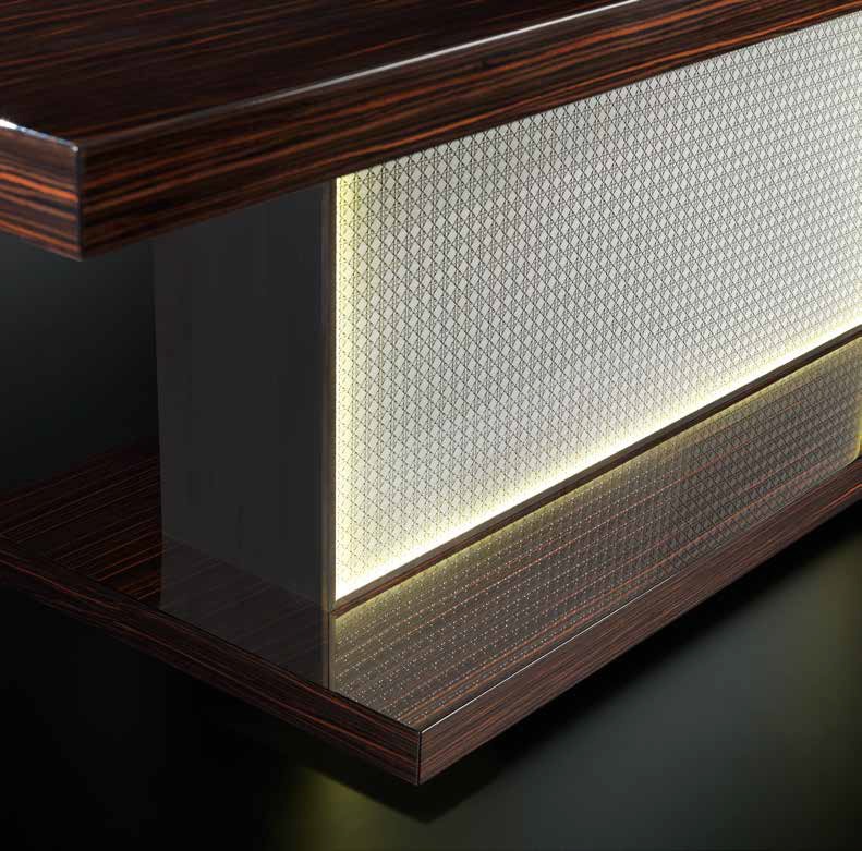 The Rialto dining table 72 from the Italian manufacturer Reflex Angelo. Elegant rectangular table with lights, made in the style of glamour that will adorn the dining room or living room. Rectangular top and plinth made of solid wood with a thickness of 6 cm finishing: shiny lacquered, shiny ebony or in shiny dark mahogany. The glass base is covered with engravings of Dune, San Marco or Vienna design; base also available in veneer mirrored smoky gray etched glass. Base equipped with led lighting system. Finish - burnished brass.Colors to choose in stock.