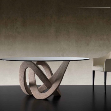 Dining table 72 Andromeda from the Italian manufacturer Reflex Angelo. Model, made in art Deco style, suitable for use indoors, and outdoors or the outdoor terrace. Round table top made of transparent glass thickness 15 mm with a conical chamfer on the edge. The base serves as a figure carved from granite construction material. Colors - transparent, the color of natural stone.