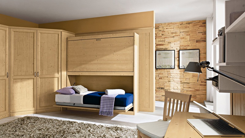 Cabinet with built-in beds from the Italian manufacturer Callesella. The model of two single seats with a folding bed tucked away in a closet. Made of natural quality materials. The bottom is made of planed slats that provides excellent ventilation of the mattress and bed linen. All elements of the fasteners and accessories of good quality metal. The mattress and linens can be fixed rigid straps that make lingerie to fall. Panels light wood color of straw.