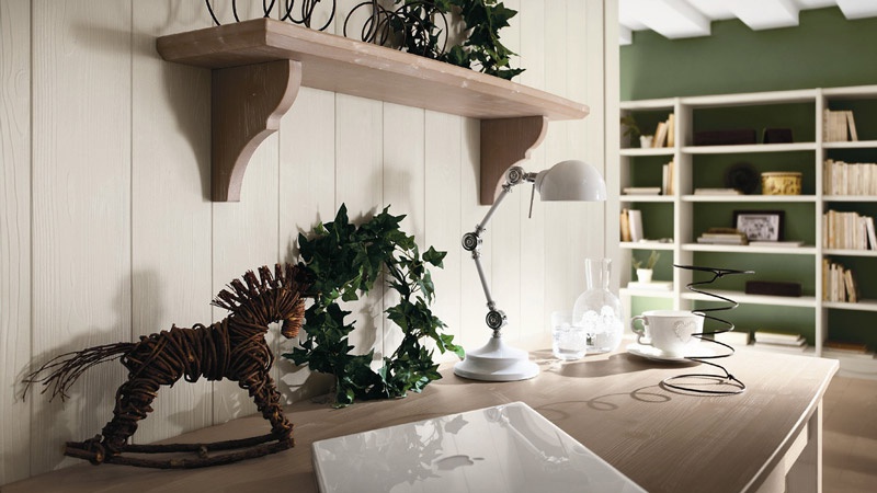 Headsets for bedroom with bunk bed LUNA from Italian manufacturer Callesella. Set with bed, chest of drawers, Desk, chair, shelves, a bookcase and a modular system for storage. Dresser with four drawers. Chair cover textile. Book shelves with open shelves.