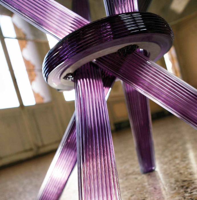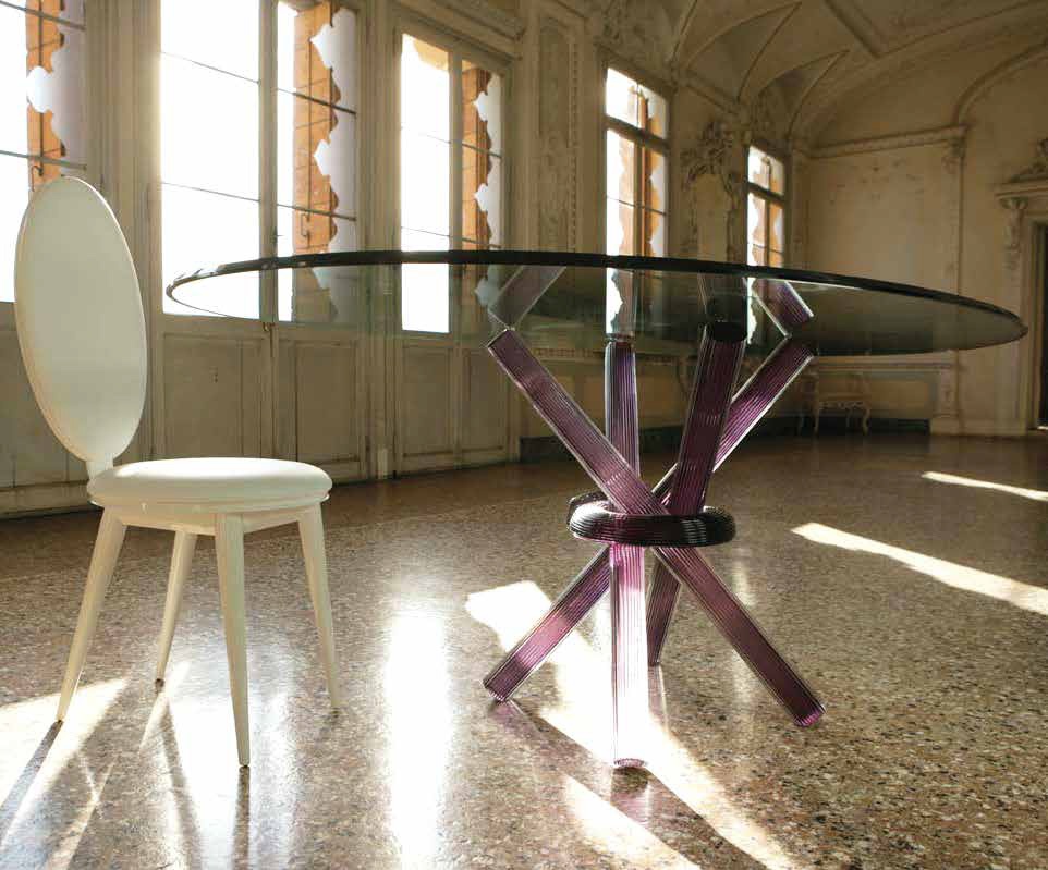 The Arlequin 72 dining table from Italian manufacturer Reflex Angelo. Original model from designer Maurice Barilone, in the style of glamour that will adorn the dining room or living room. The counter is made of transparent glass thickness of 12 mm or 15 mm with a conic chamfer; available rectangular, round and oval models. The base is made of Murano glass in the form of three legs, connected by a ring in the middle. Available in different colors, with a shiny smooth surface or with a smooth surface in sanded and shiny with ribbed trim.