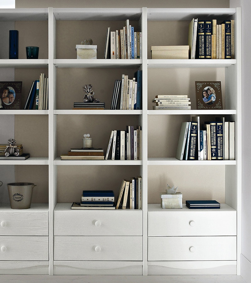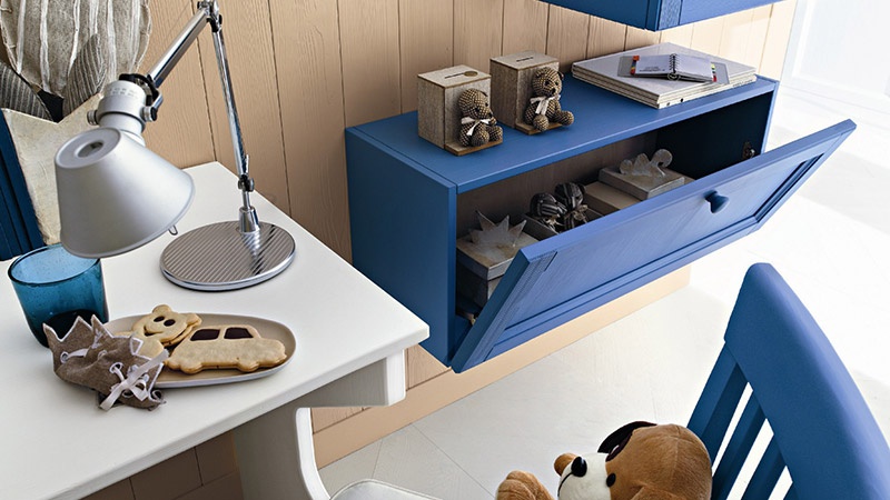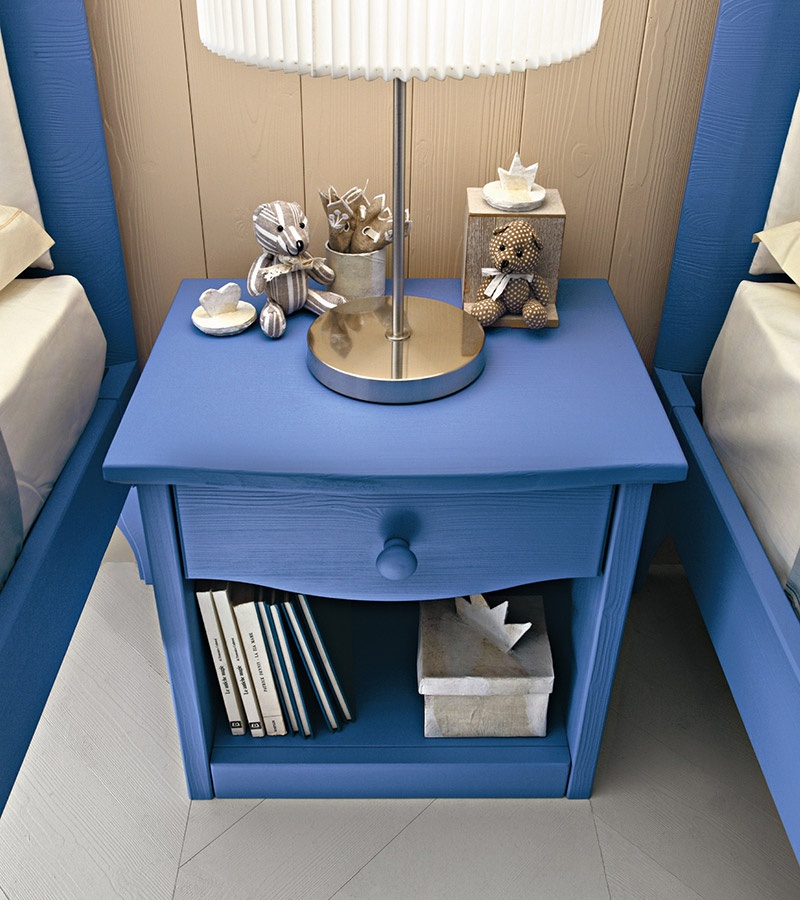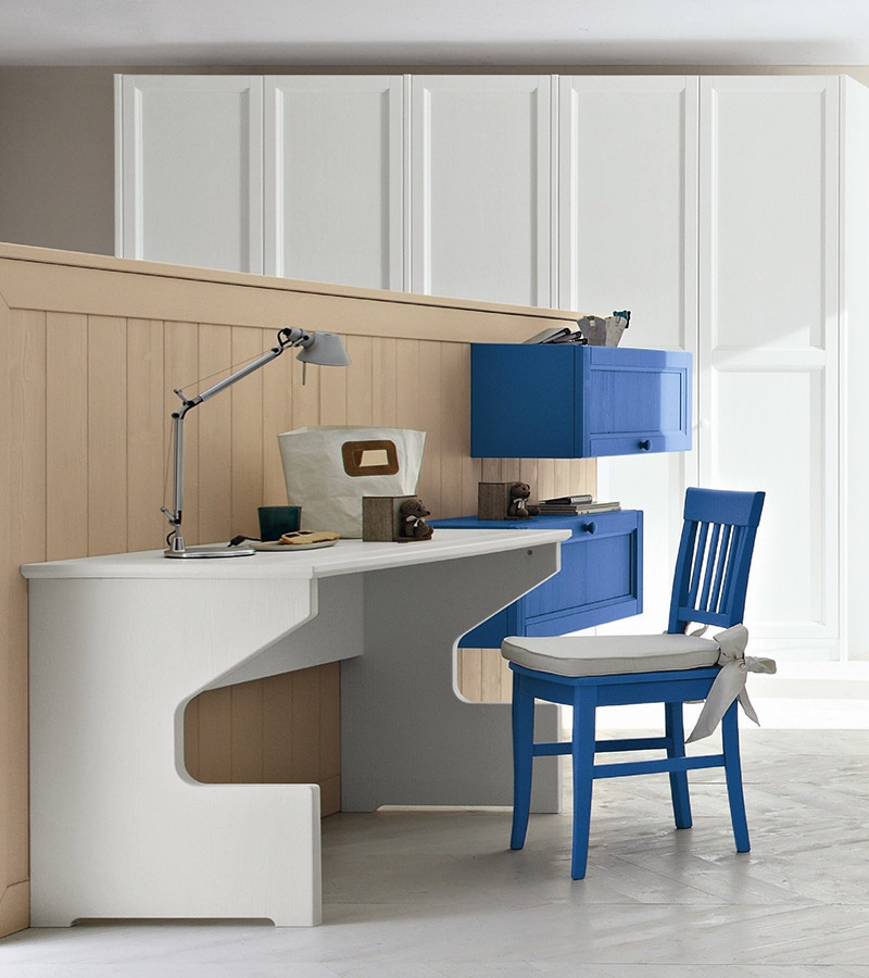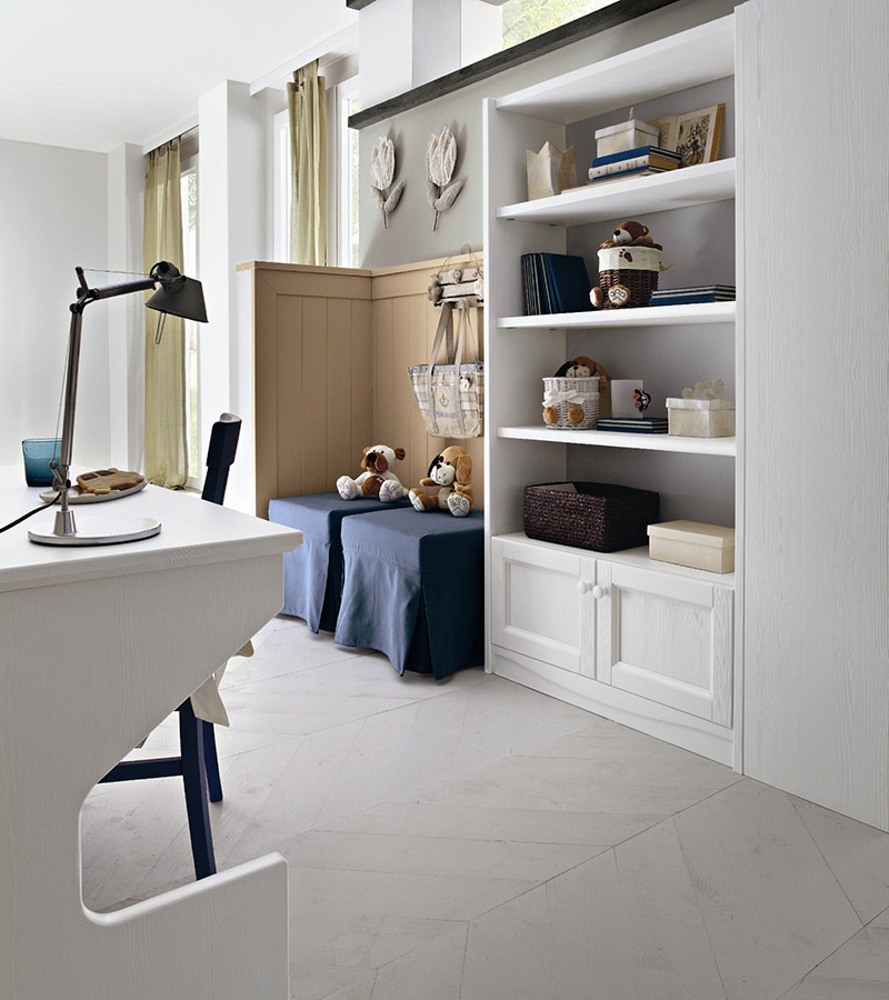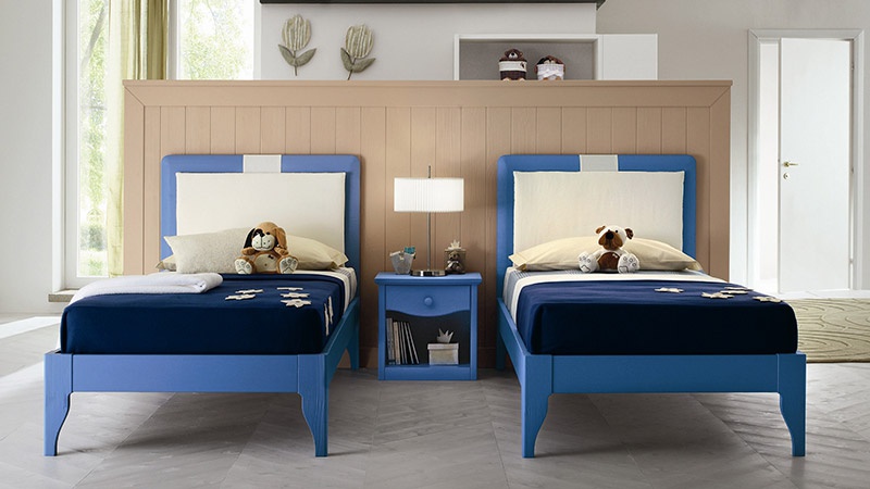 Headsets for bedroom with two single beds STELLA from the Italian manufacturer Callesella. Set with bedside table, a Desk, a chair with a soft pillow, a bookcase with hinged doors, bookcase with drawers, wardrobe and two single beds. Bed with high headboard, with removable cushions. Wardrobe with five doors.