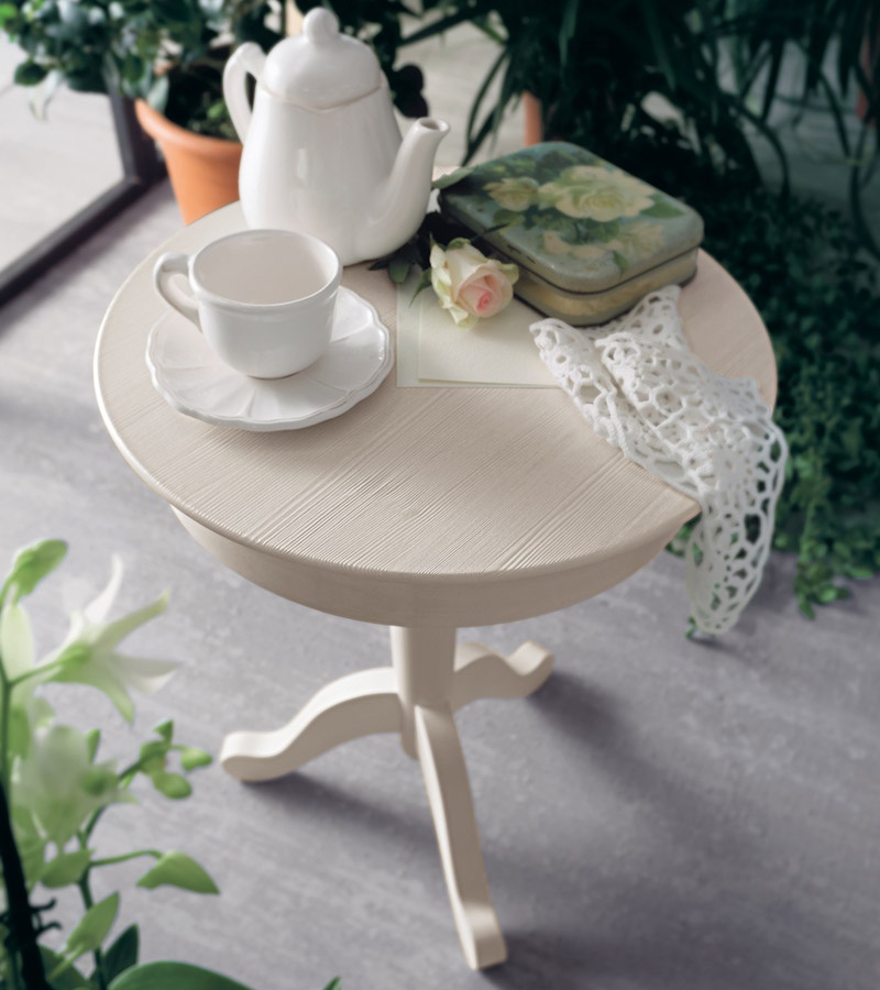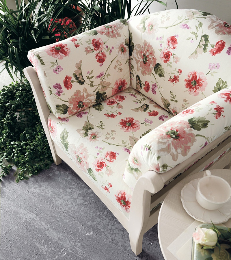 Sofa set Talcato Canapa from Italian manufacturer Callesella. A Seating area with a round table on carved leg sofa and armchair in fabric. The filler is polyurethane foam with different densities. Color-hemp and floral fabric are the main ingredient. The model which was designed to convey a happy, fresh and relaxing atmosphere. Wooden furniture with light, glowing colors typical of the Mediterranean.