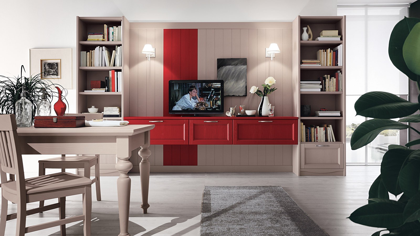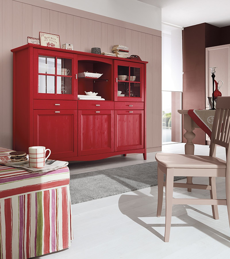 Sofa set Tortora e Amarena from the Italian manufacturer Callesella. The concept of country style for the interior. Simple lines with good play of color. The set of cupboards with glass doors, shelving, cupboards, modular systems, table with chairs. Used for the manufacture of high-quality wood and materials. Main lines and peculiar color for a modern style. This living room is the perfect solution for furnishing and conveys the atmosphere of a typical country style.