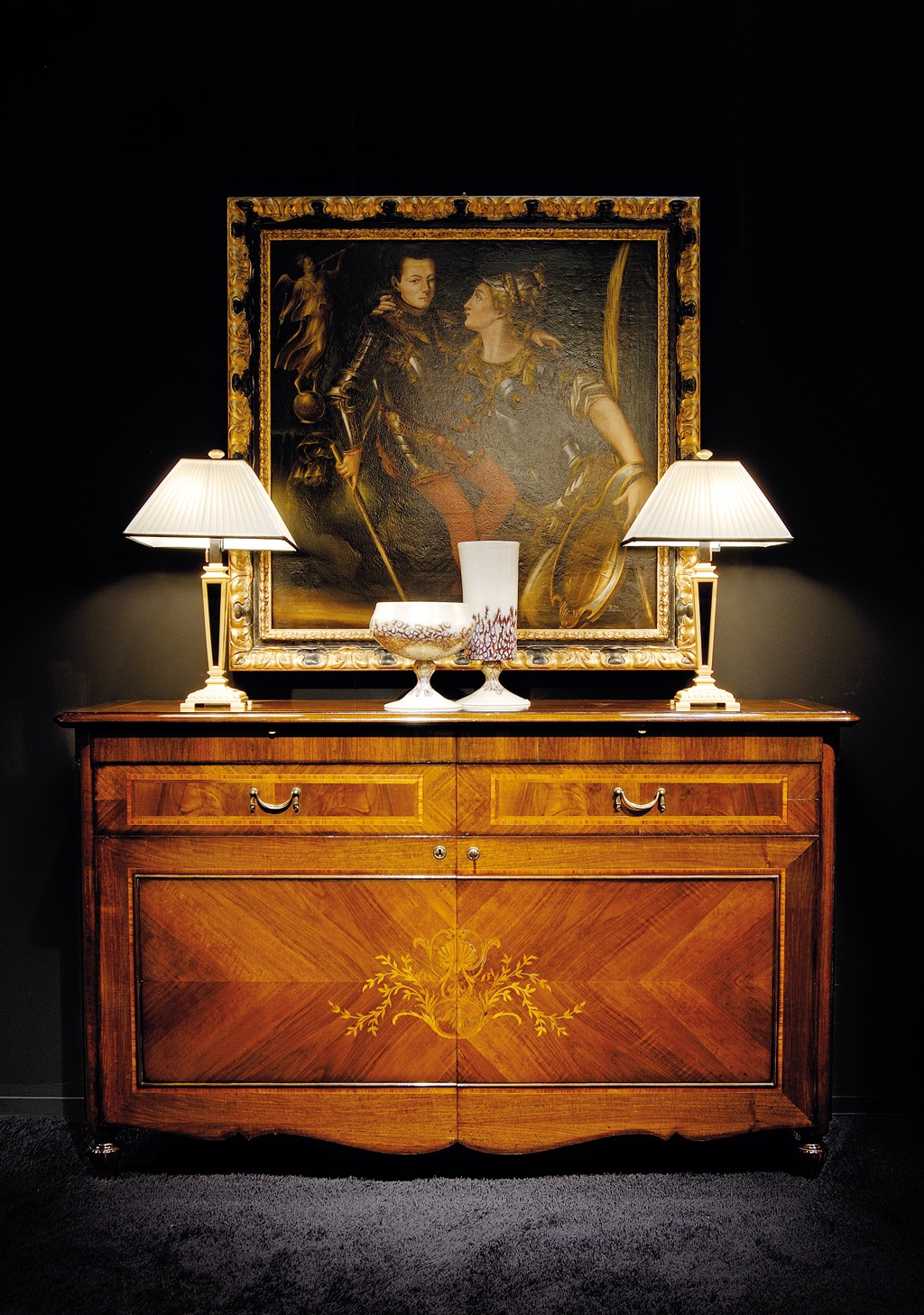 A chest of drawers from Italian manufacturer Medea. Includes two drawers and two boxes with hinged doors. The body is made of wood. Accessories metal. The finishing - varnish. The model is made in classic style.