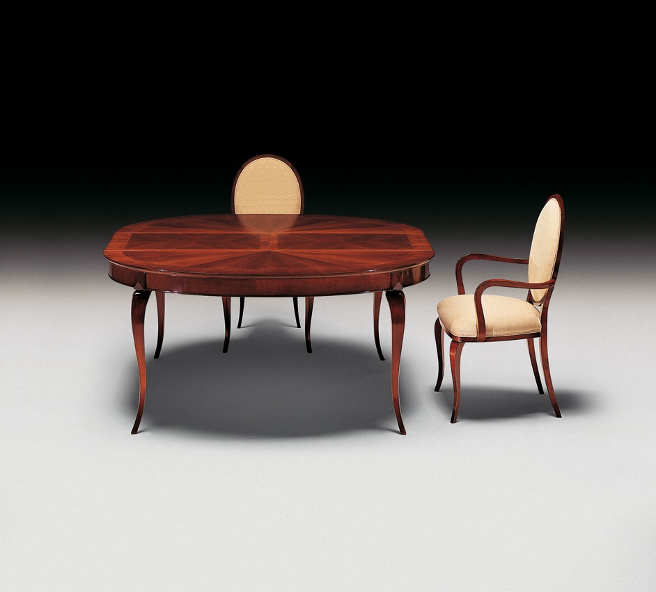 Dining table from the Italian manufacturer Medea. Table top and curved legs made of wood. The surface is treated with glossy varnish. Distinguished by elegance and practicality.