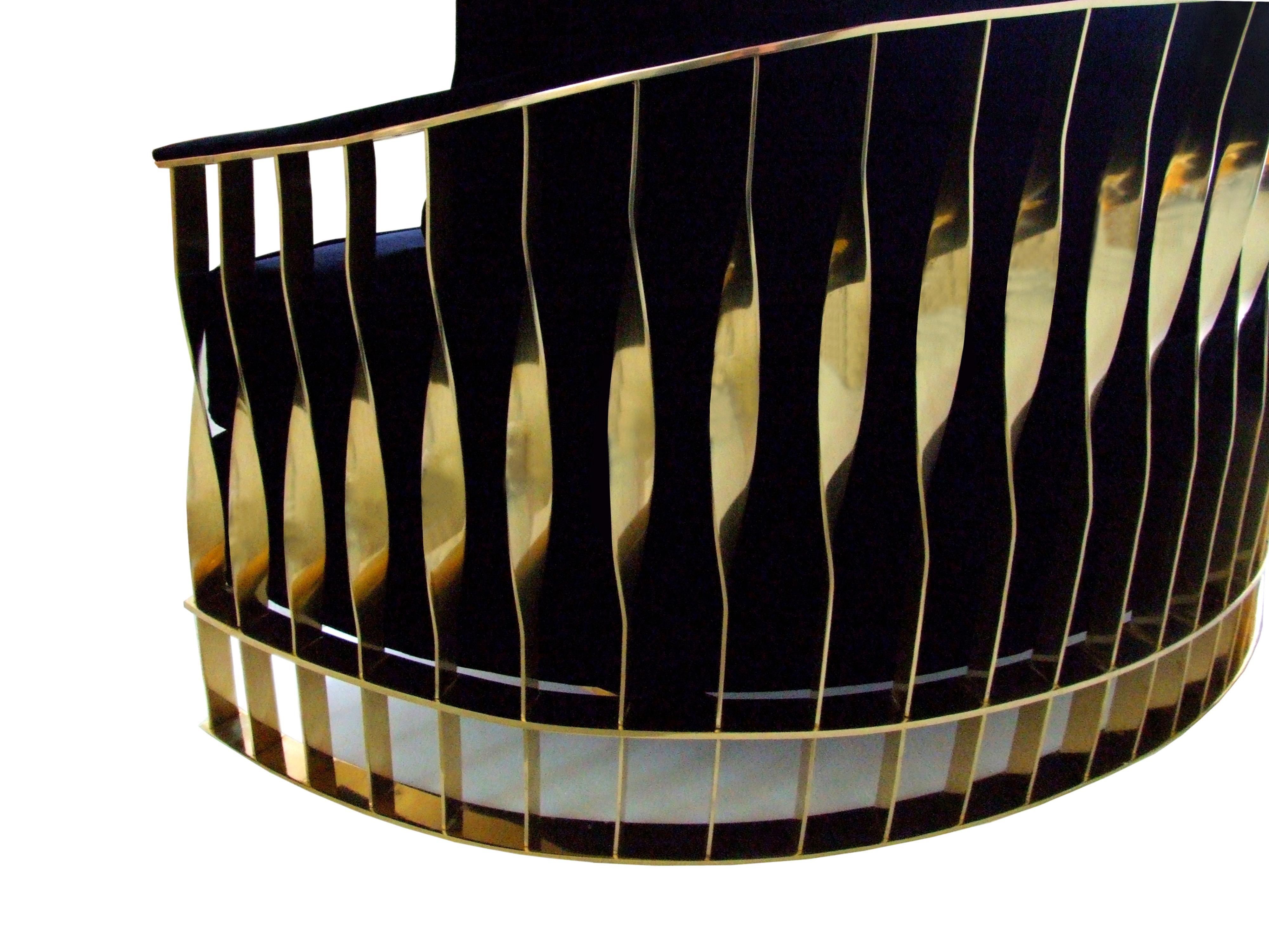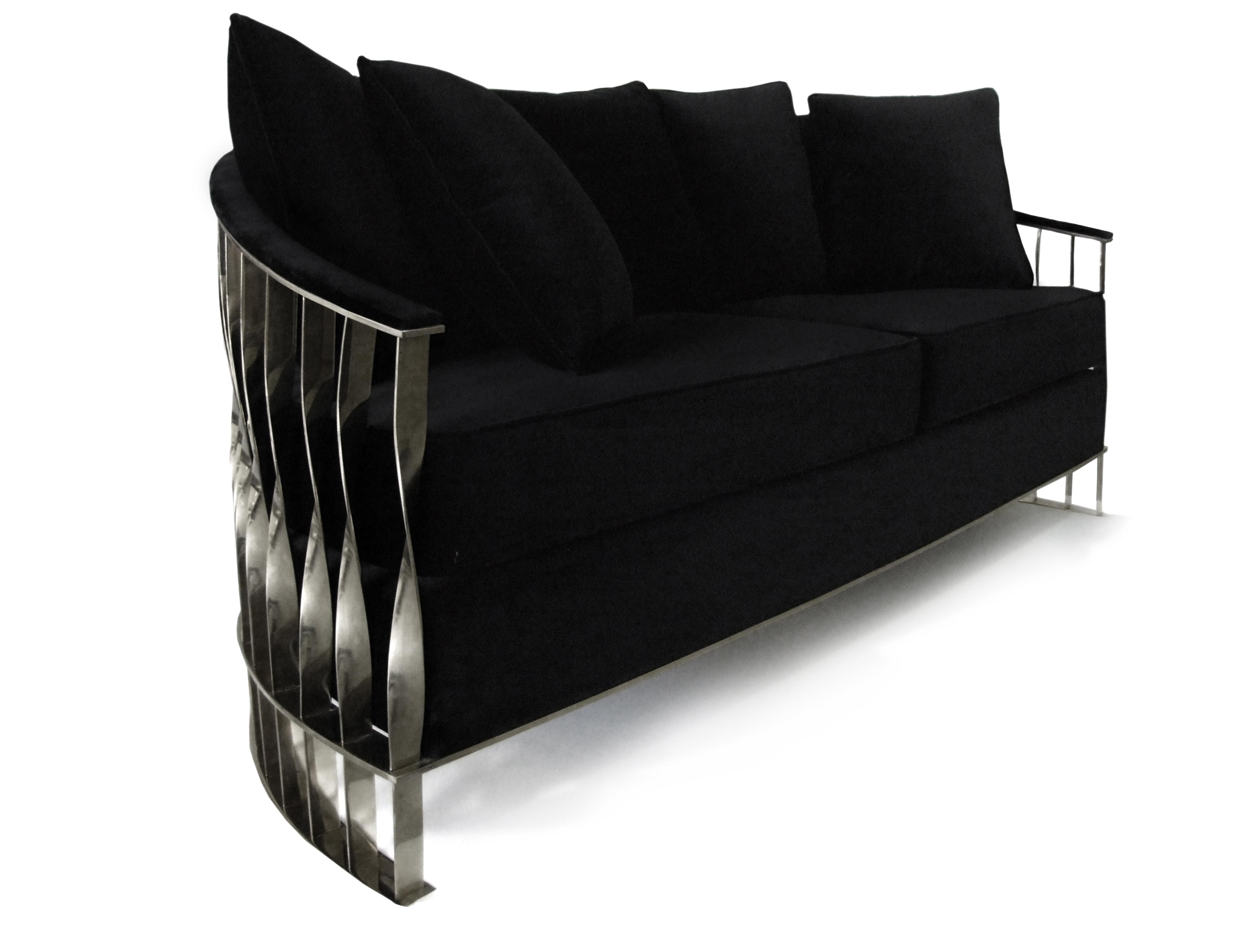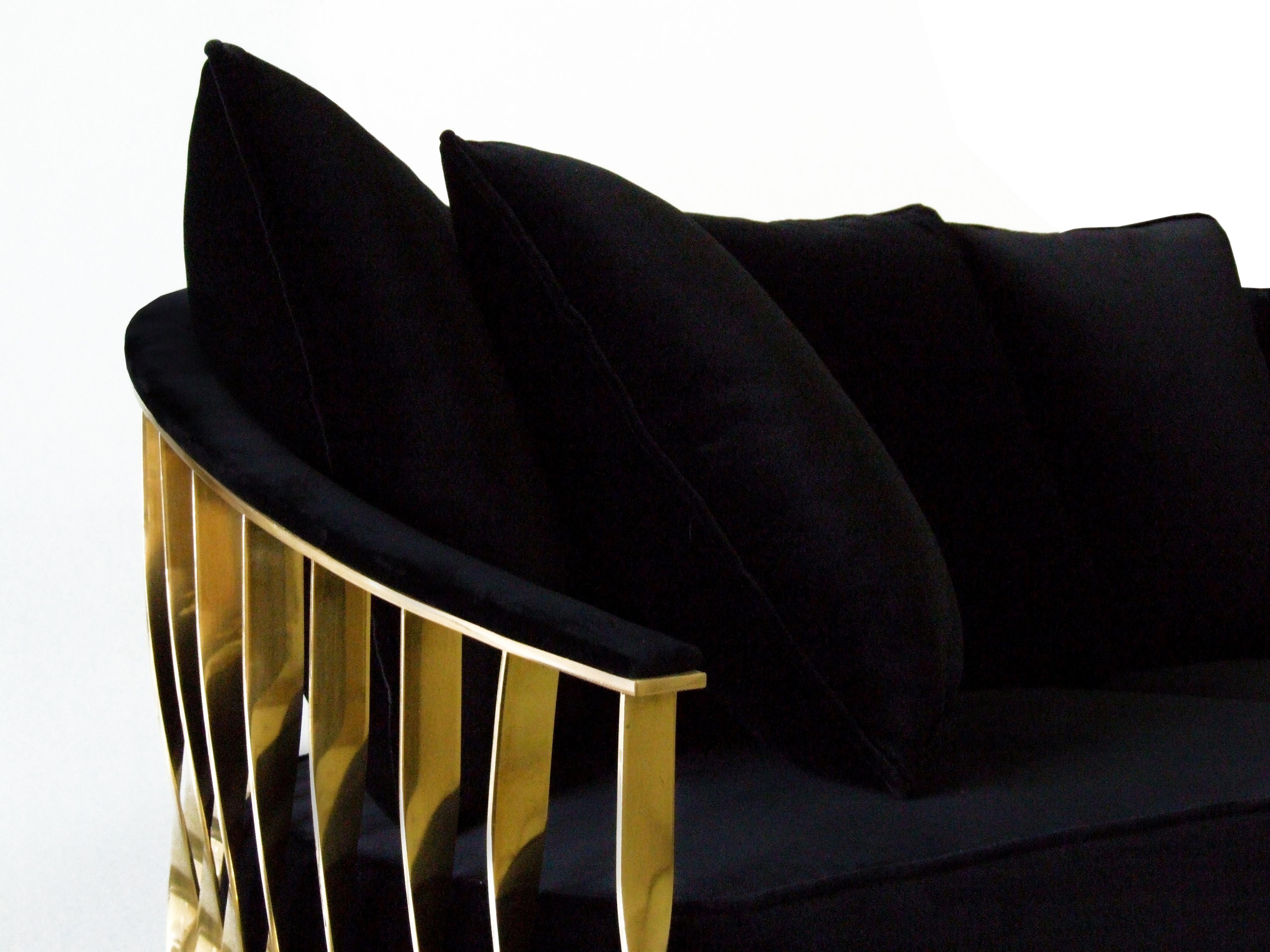 The Mandy sofa from Portuguese proizvoditelei Koket. Shiny brass frame (optional can be replaced by stainless steel), upholstered black velvet upholstery and cushions can also be changed to any fabric from a catalog company. Perfectly complement the interior of your living room. It has 7 pillows.