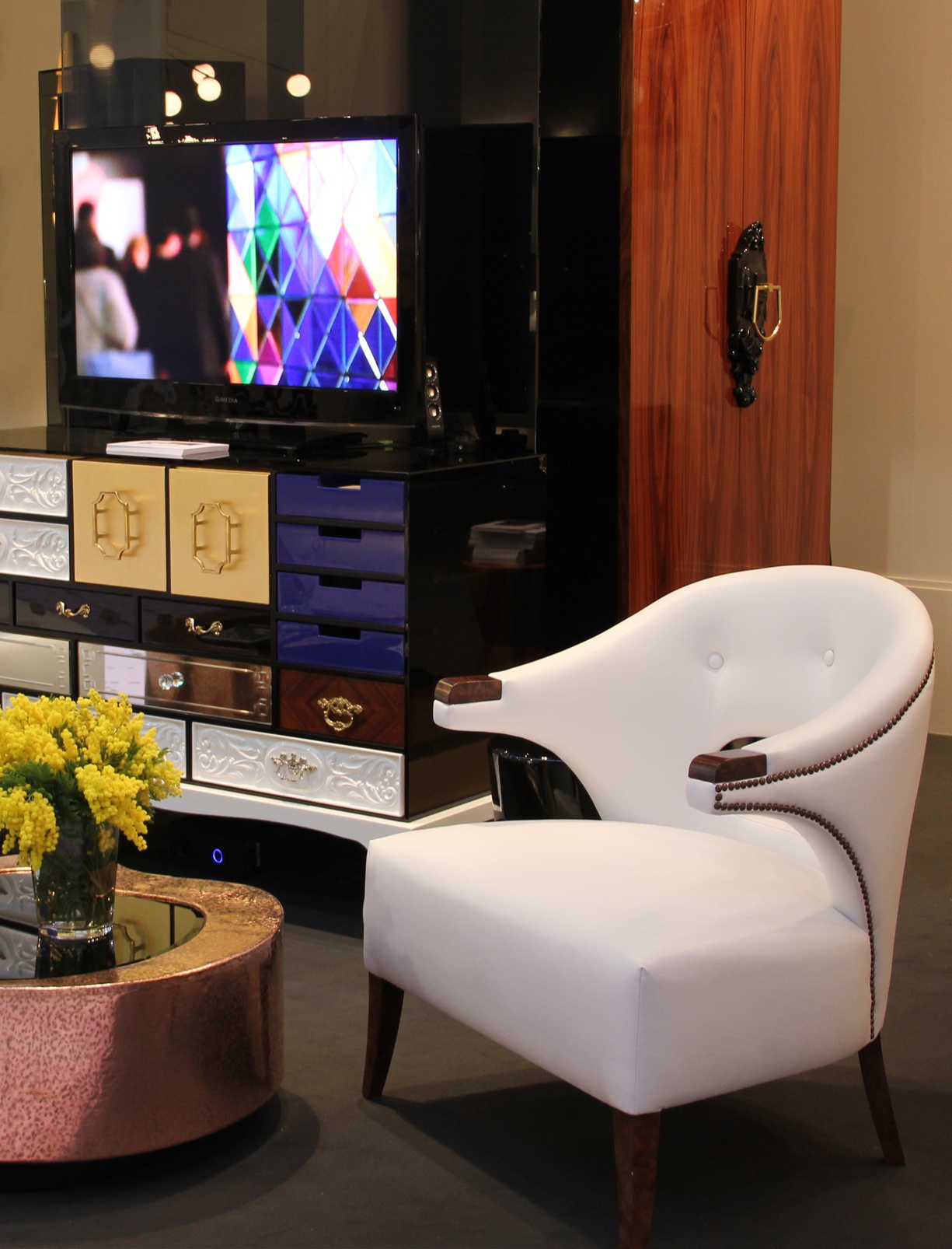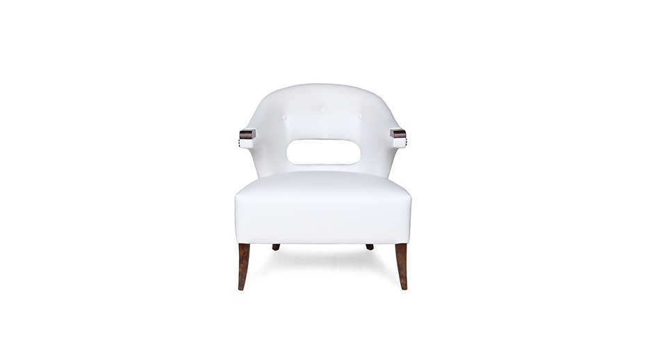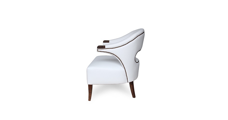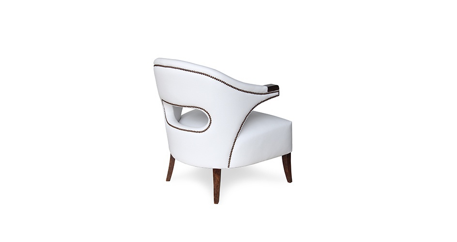 NANOOK armchair from Brabbu Portuguese manufacturer. The frame is made of wood. Feet in walnut with a coating of glossy varnish. The leather upholstery in white. The filler of polyurethane foam. Armrests with brass inserts. Decorated with furniture nails. The model represents the host bears. What decides the luck of the hunters in the Arctic regions. Combines the beauty and grandeur of a healthy animal body. The chair embodies the culture of the Inuit people and tells their stories and myths.