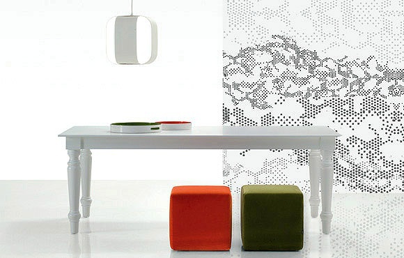 Madras dining table from Italian manufacturer Poliferm. The table is rectangular. Finishes: Matt lacquer and protective coating against scratches. Color options white, hemp and graphite. Worktop can be made of white marble or black granite. The legs are made from solid wood.