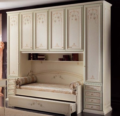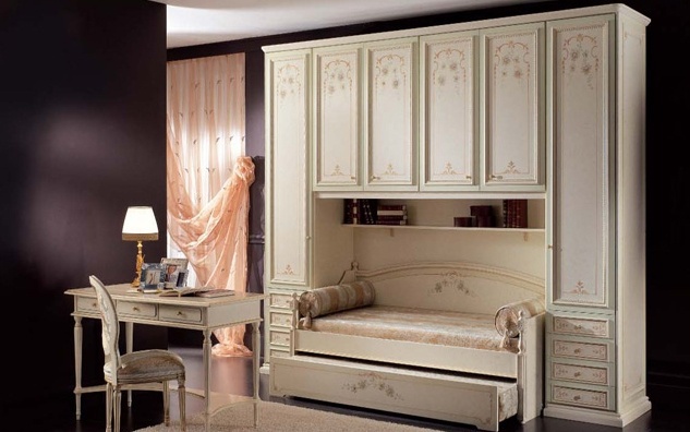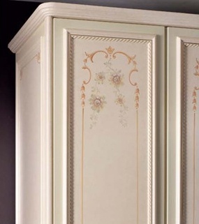 Tresor wardrobe Armadio from the Italian manufacturer Pellegattta. A handcrafted Cabinet. Made in the shape of the letter "P" in the center is a built-in niche for the bed or sofa can be a bunk with additional pull-out bed. The facades of the wing have drawers, open shelf for books. The number of sections and the arrangement at the request of the client: size of the section is a multiple of 50 and 100 cm from the Frame tamburino plates with cellular filling on the basis of solid spruce, the basement and the facade is an array of ramino. Narrow sash decorated with carved edging. Finishing is performed manually coloring in any colors from the range or by a given sample. The d?cor of paintings made in the technique of miniature used tempera, 6-8 colors, drawing from the catalog of the factory or on the customer's sketch. The surface is covered with a substance, which protects it from scratches and damages. Decorative accessories metal. The series includes a Desk and a chair of similar design.