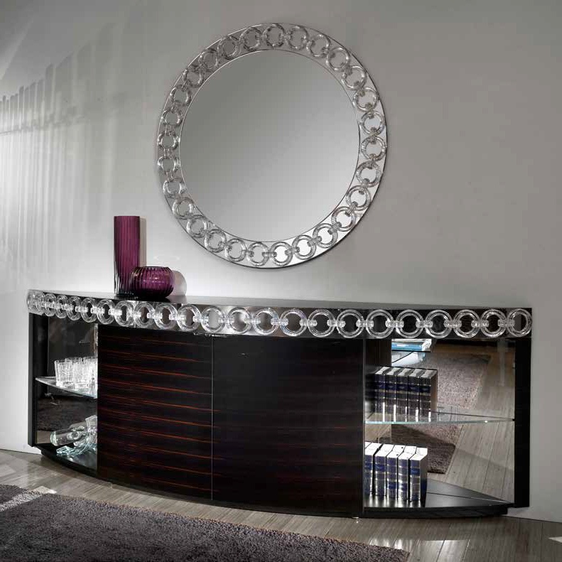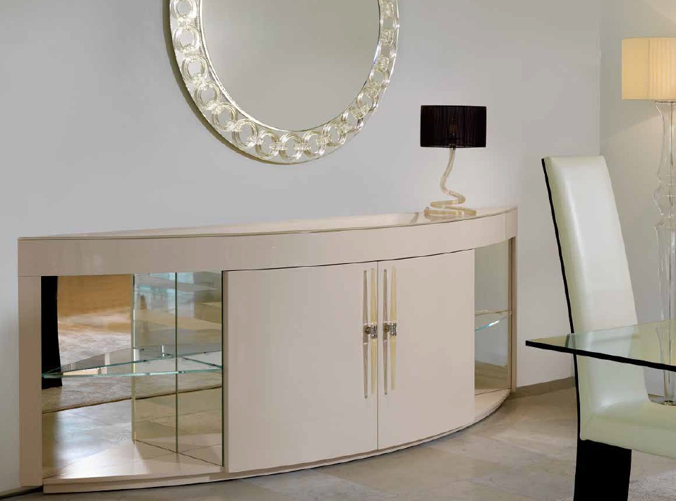 The long buffet Casanova from the Italian manufacturer Reflex Angelo. Elegant model with shaped front, combining the lightness and finish of expensive materials, decorated with a glamorous interior living room or dining room. The frame is made of lacquered wood standard colors; also available the model of black wood, shiny or Matt. The Central part of the sideboard with two doors from bent wood and interior drawers, with handles made from lustrous lacquered metal, silver finish, either from transparent or colored Murano glass in the shape of a pendant. On the sides - curved open glass shelves on a mirrored background. Jewelry made from Murano glass, gold, transparent or colored. Colours in stock.