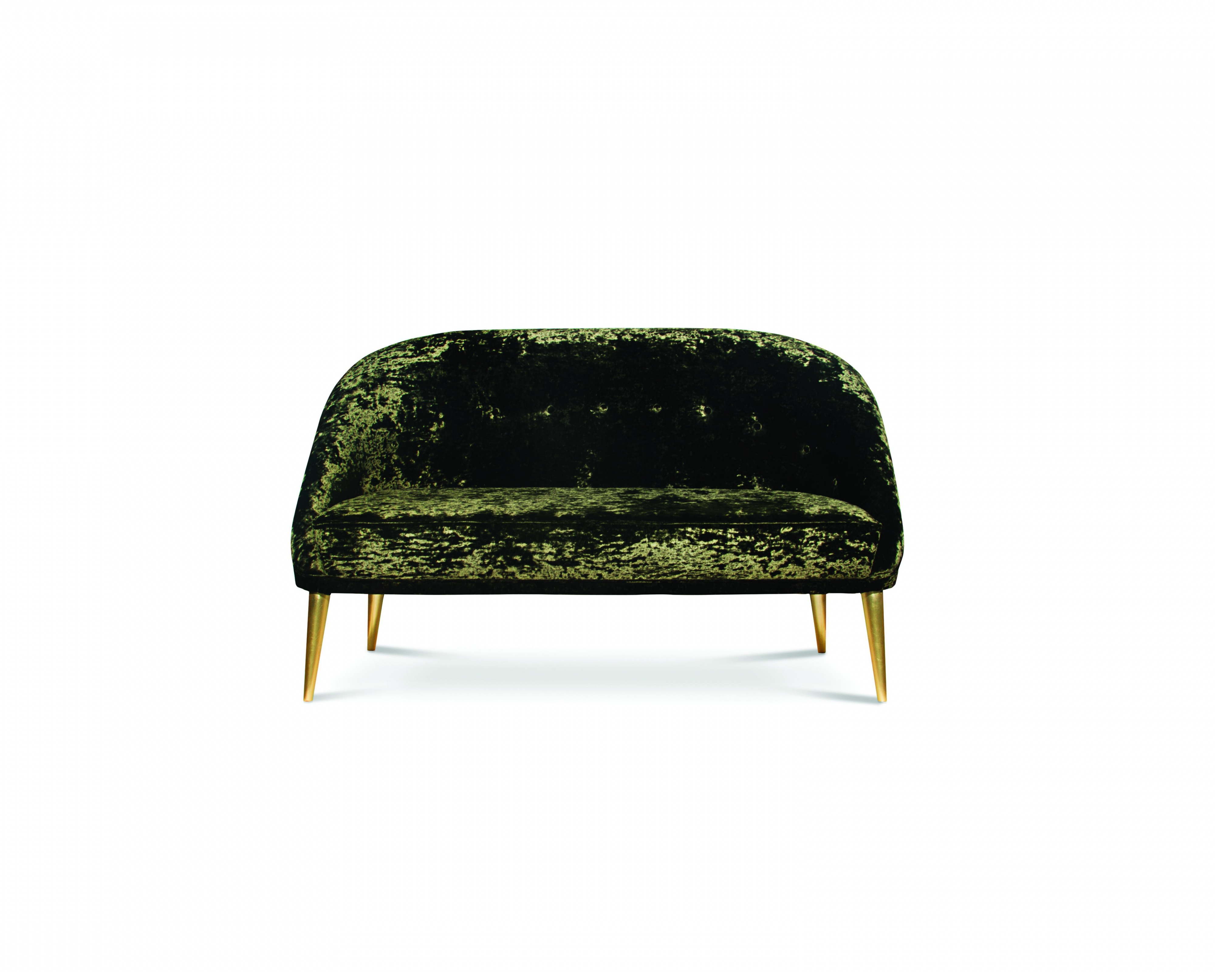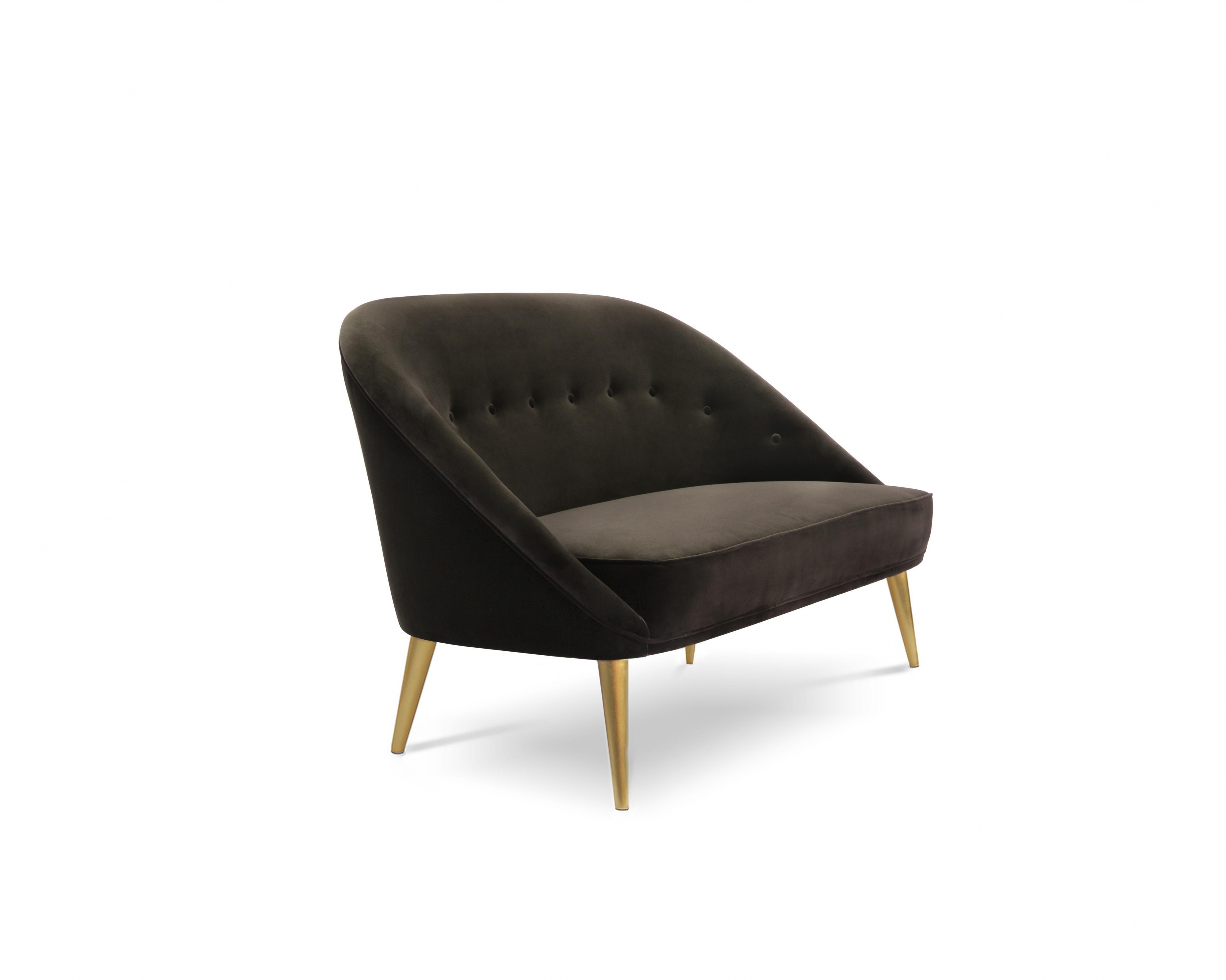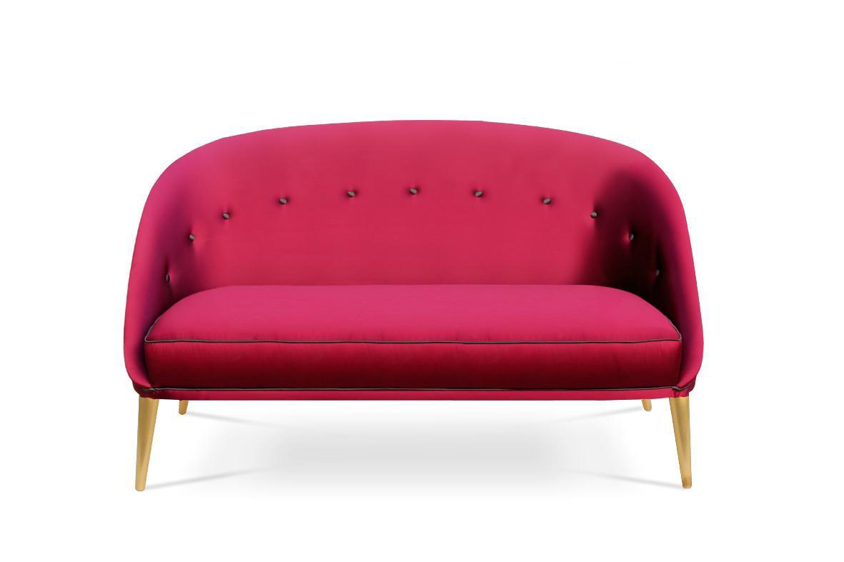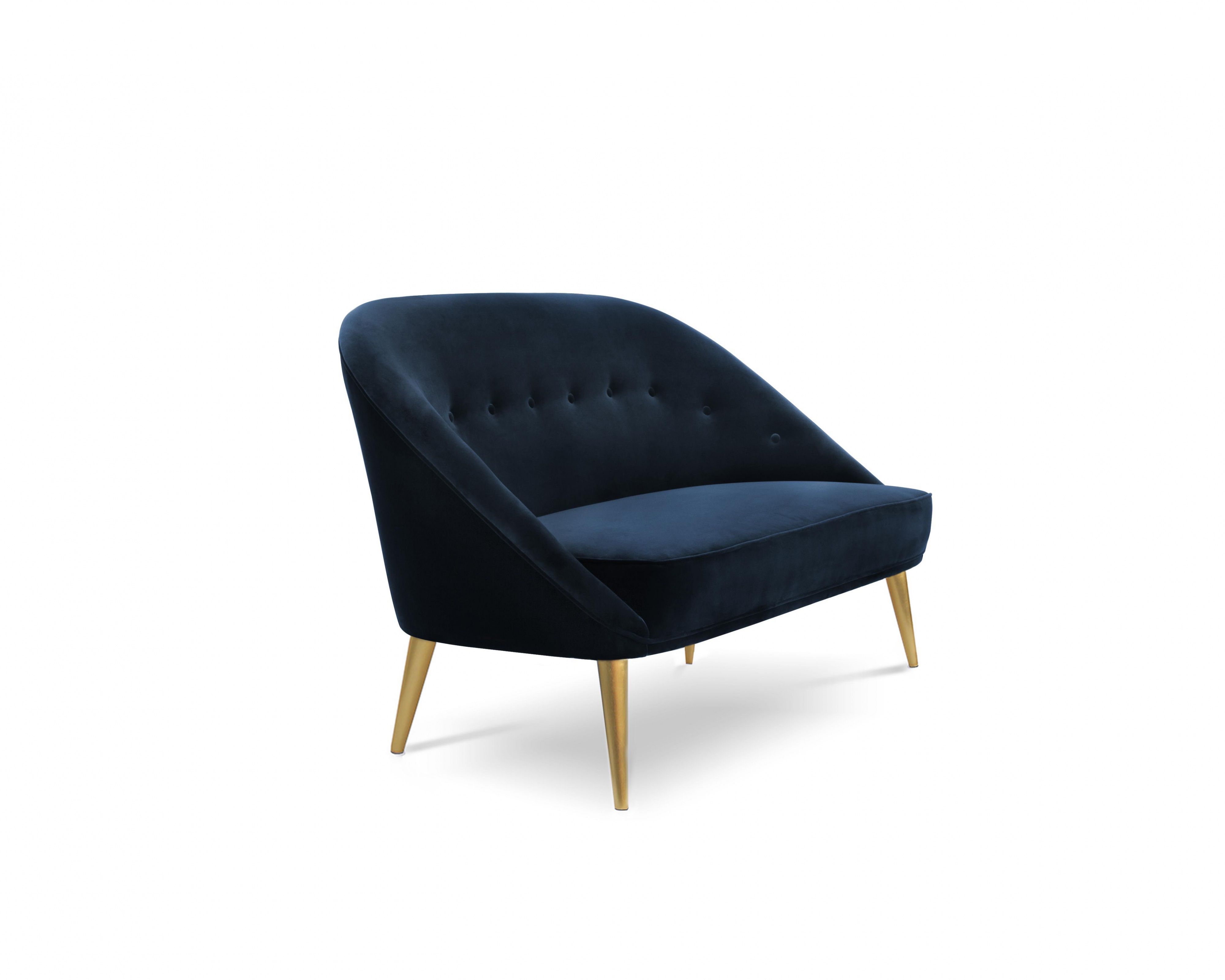 Sofa Nessa from Portuguese firm Koket. Elegant and soft, as a modern woman. Shiny high quality satin upholstery and gilded legs. Possible replacement of upholstery on the directory and finish the legs copper or silver sheet and painting any color on the catalog.