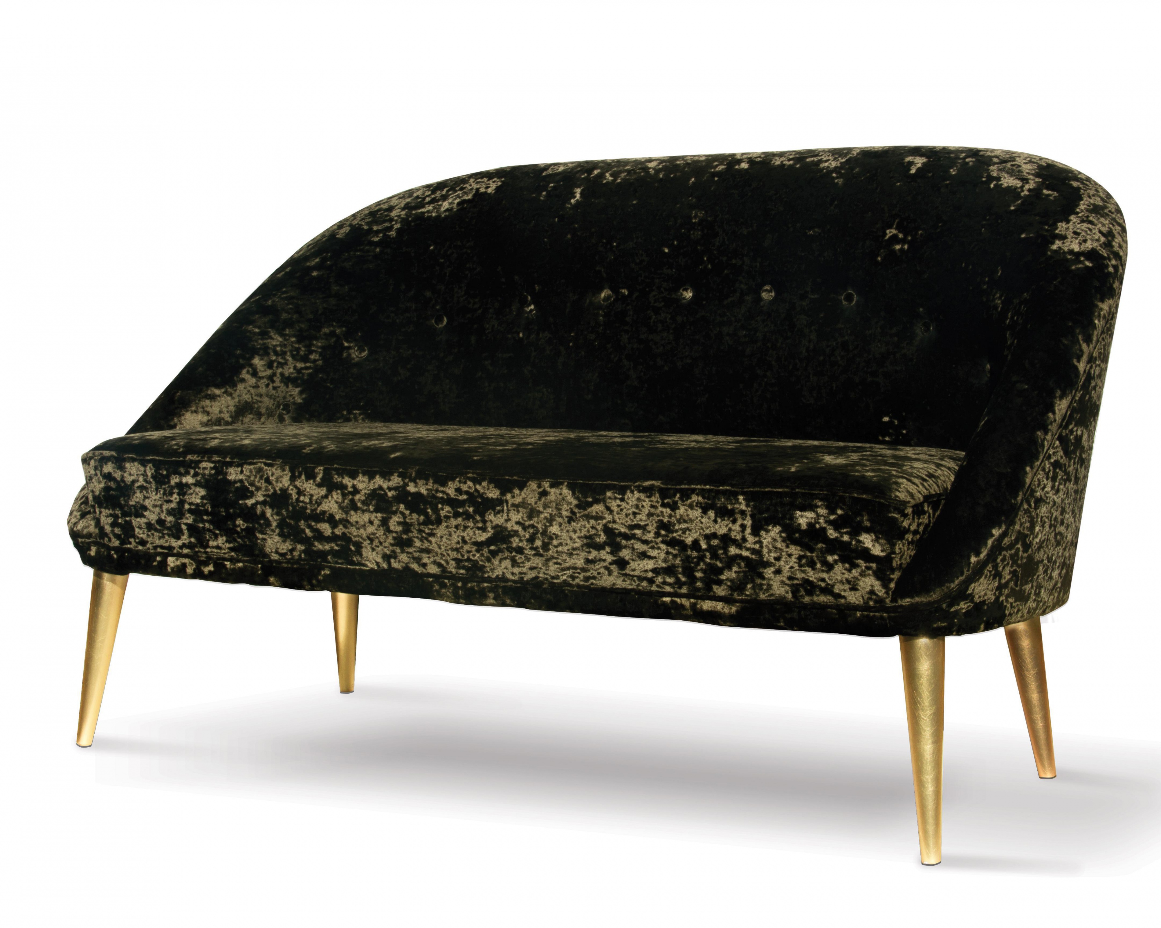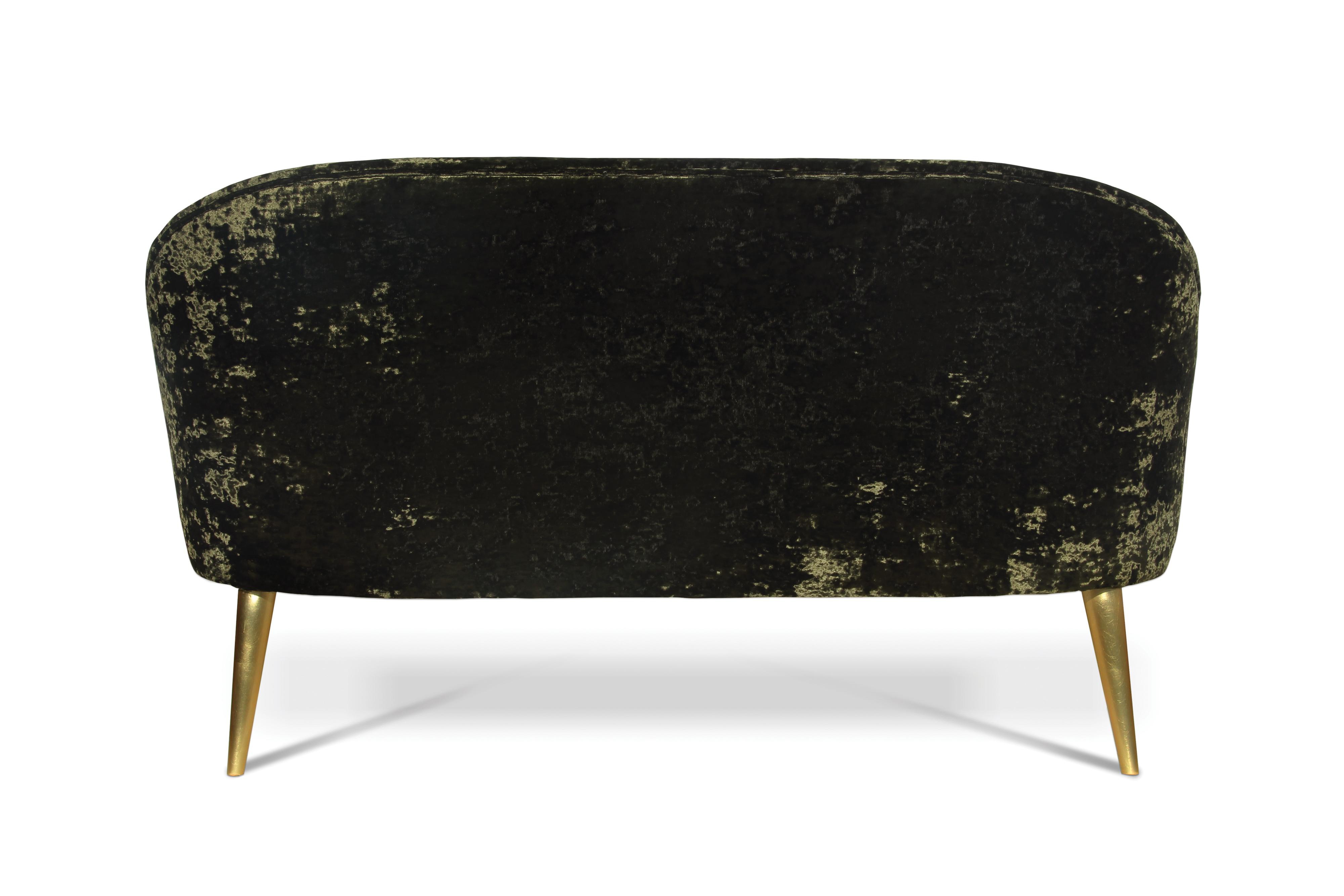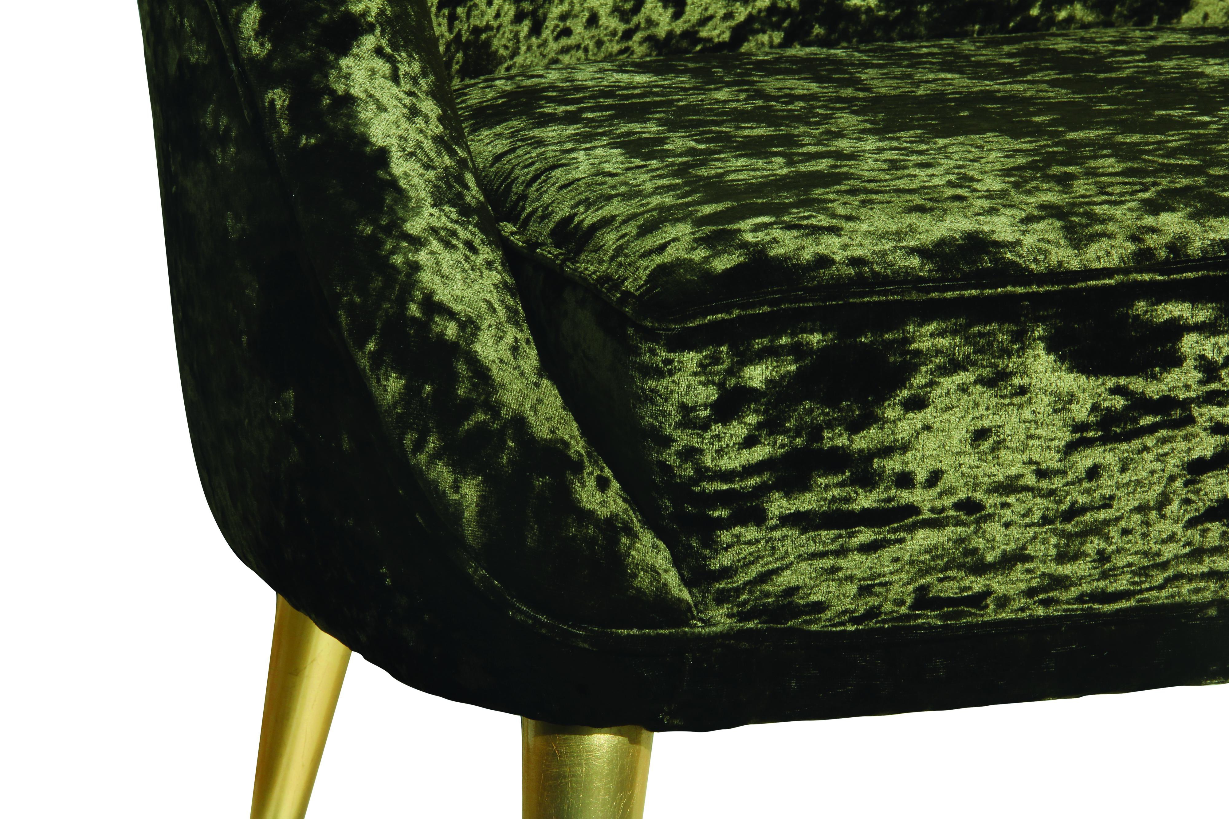 Sofa Nessa from Portuguese firm Koket. Elegant and soft, as a modern woman. Shiny high quality satin upholstery and gilded legs. Possible replacement of upholstery on the directory and finish the legs copper or silver sheet and painting any color on the catalog.