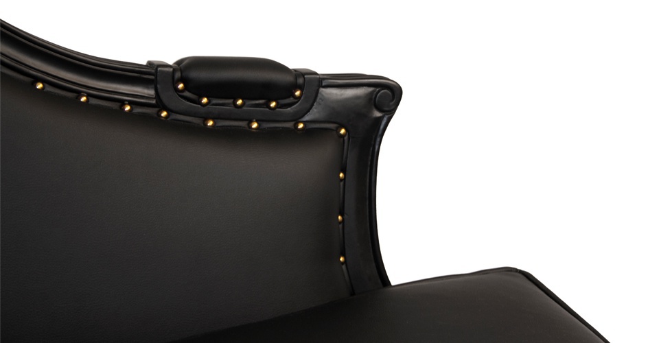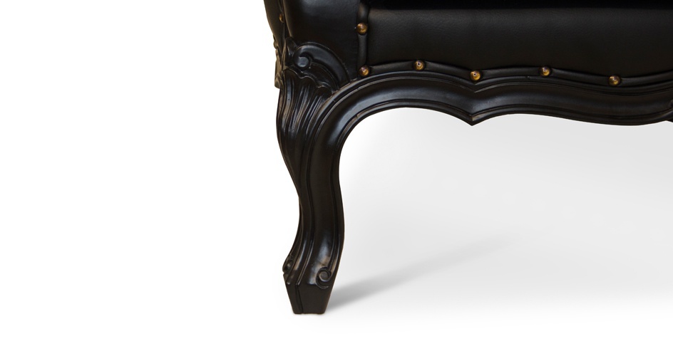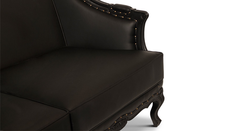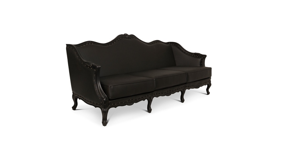 Three seater sofa OTTAWA from Portuguese manufacturer Brabbu. The carved frame is made of wood. The model expresses the beauty in the combination of curves forms and elegant carved wood details with a dark color. The black leather in matte black lacquer frame. The frame is bordered with Nickel polished furniture nails, distributed along the seat, armrests and wide back with equal intervals. The sofa is available in other colors and upholstery.