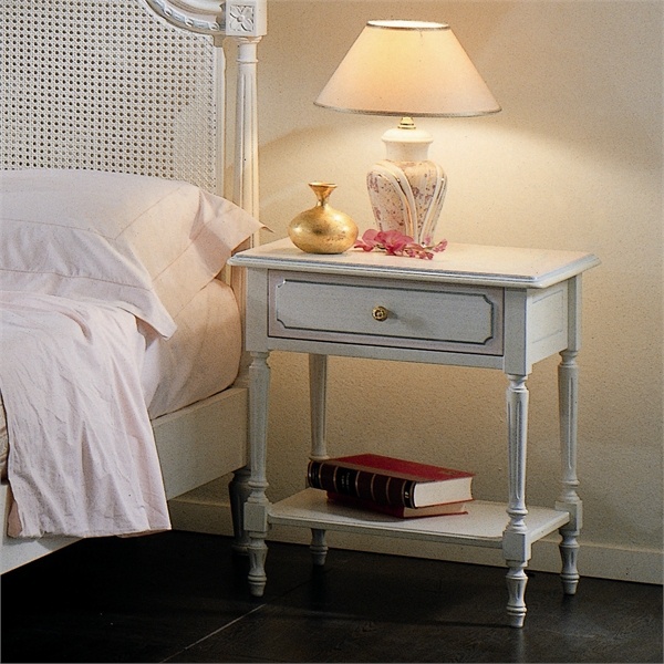 Bedside table handmade Vera Comodino from the Italian manufacturer Pellegatta. Top drawer rests on tall turned legs, United by an open shelf. The frame is made from tamburino, plate with honeycomb on the basis of solid spruce. The drawer front of solid Ramin, ramin is a rare tree species of South-East Asia. Wood manually painted in any color from the catalog company. Only hand finishing, carving and painting in the technique of miniatures. For painting is tempera 6-8 colors, a picture from a catalog or based on the customer's sketch. The surface is covered with a substance, which protects it from scratches and damages. The series also includes a wardrobe, bed, Desk, chair.
