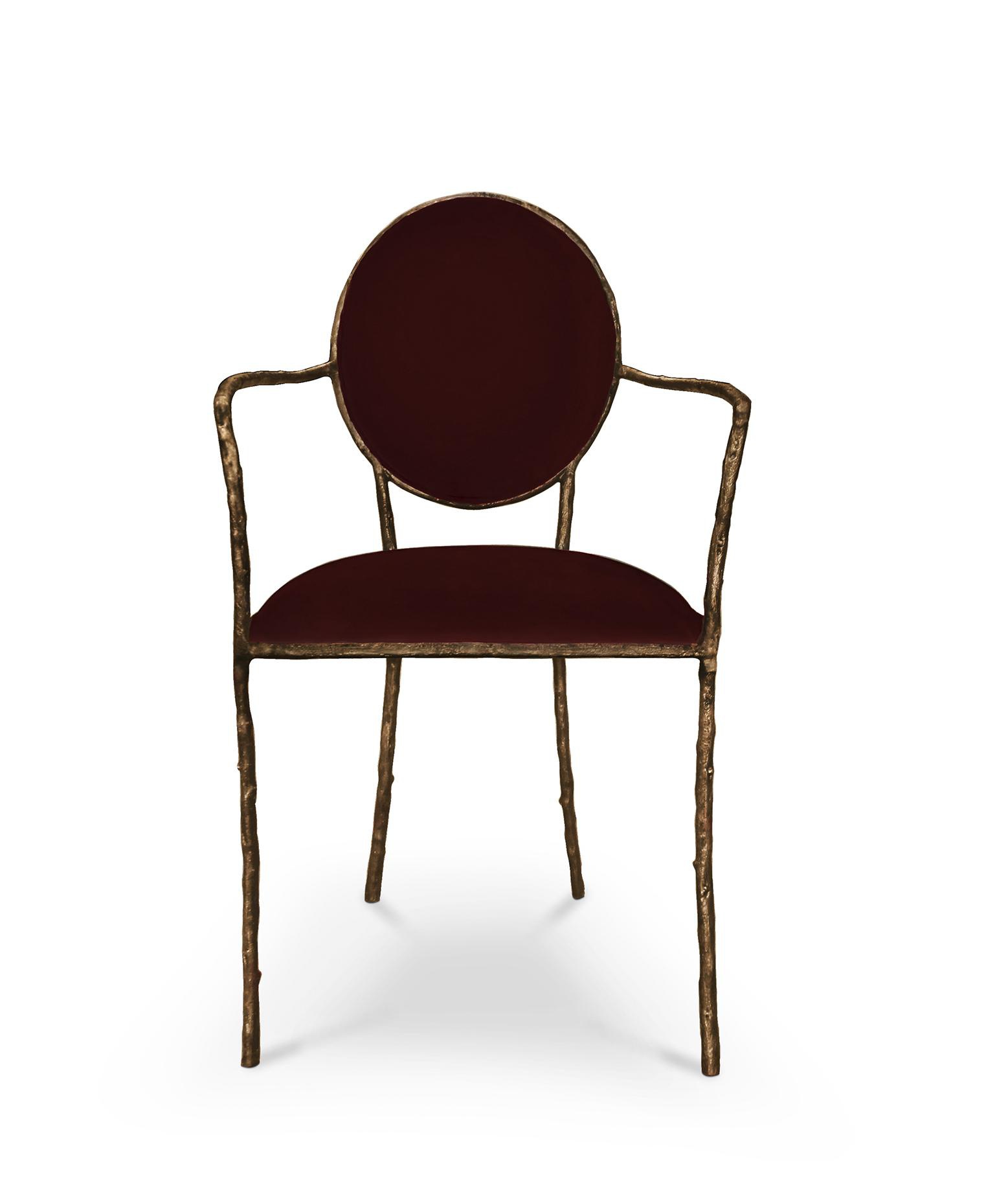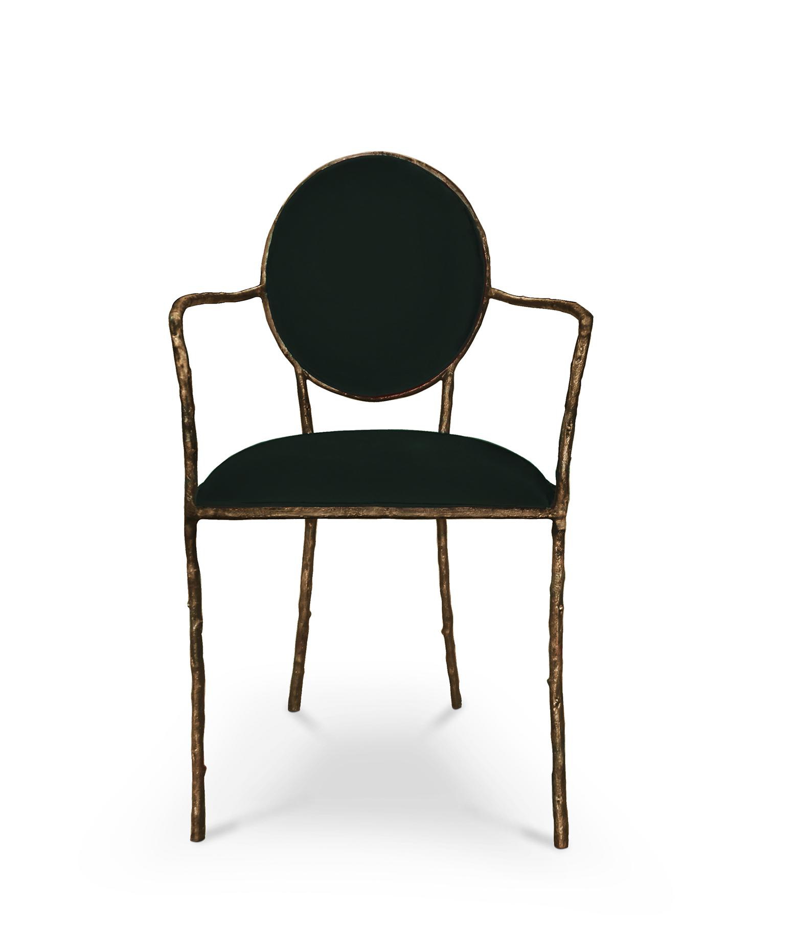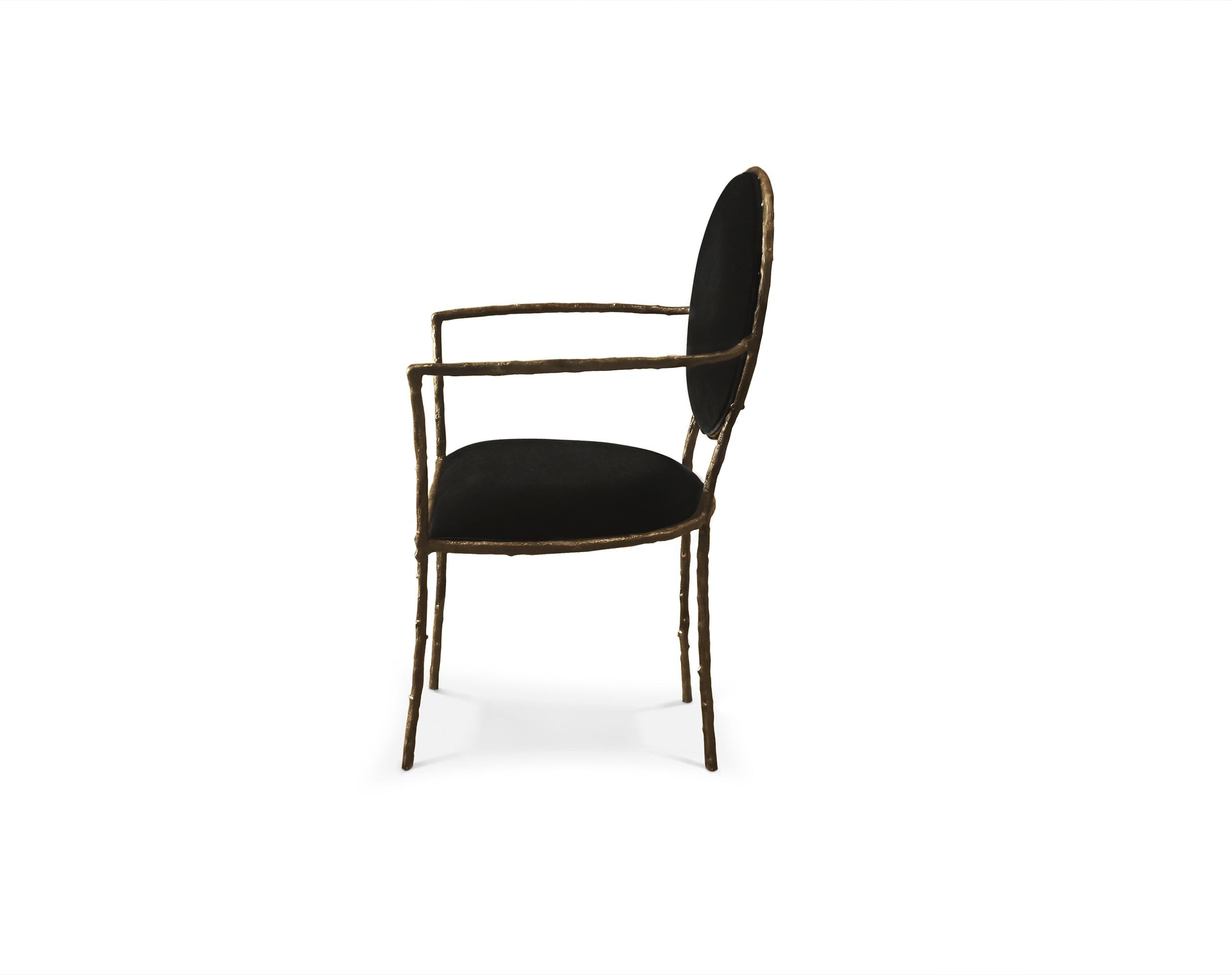 Dining chair Enchanted II from Portuguese manufacturer Koket. Brass with oxidized gold leaf and velvet upholstery. Branches antique gold hypnotize and enslave. Possible replacement of upholstery in stock.