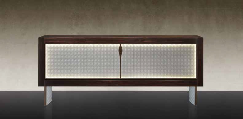 Buffet credenza CA D'oro from Italian manufacturer Reflex Angelo. The original model of the low buffet, which can also serve as a buffet, decorate a glamorous living room or dining room. The frame is a wooden structure in the finishing of Canaletto walnut wood or black in a shiny or matte varnish. Doors with metal lined glass profile with a pattern Dune, San Marco or Vienna. Solid legs on a metal frame covered with transparent glass or glass with a pattern corresponding to the design of the door. The buffet has an integrated led lighting system. Colours in stock.