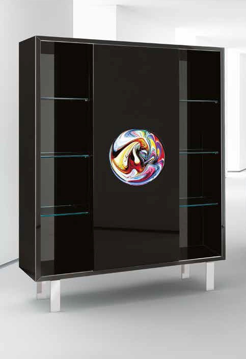 frame, door: wood frame, door: ebony legs: stainless steel doors, shelves: glass finish: Murano glass frame: lacquered |