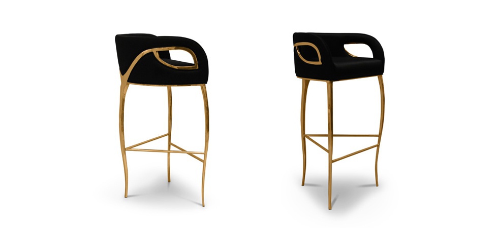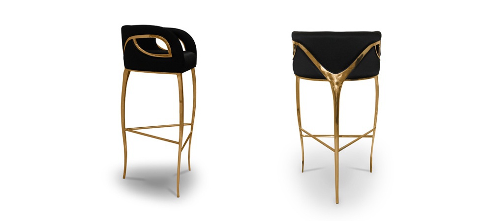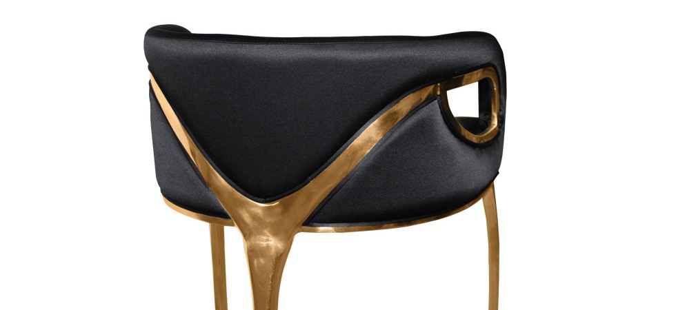 Chandra chair from Koket Portuguese manufacturer. With brass finish and satin upholstery is a bold and daring combination of old and new. On customer request we can replace the upholstery and trim frame in stainless steel.