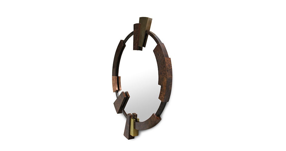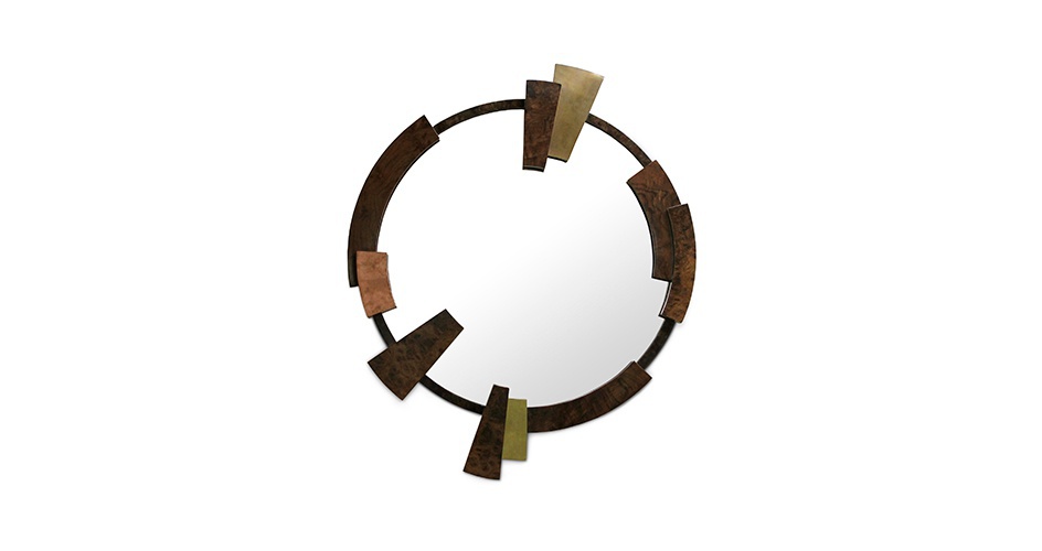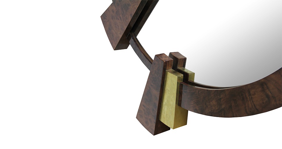 Wall mirror in frame KAAMOS from Portuguese manufacturer Brabbu. Frame made of brushed veneer of walnut root with brass and sheet copper intersect to create contrasts which are then reflected in the mirror. KAAMOS - polar circle when the sun is below the horizon for a long period - embodies the ambiguity of this natural phenomenon. In the modern interior mirror gives a touch of strength and beauty to your home.