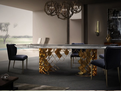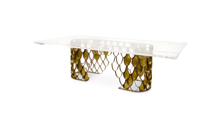 Rectangular dining table KOI from Portuguese manufacturer Brabbu. The base is made of metal brass. Countertop of acrylic. Carp is a constant symbol of Japanese culture. The Shine of the sun reflected on the surface of the base of brass. Its natural color has the ability to adapt as the model itself. The image is often used for decorative purposes, not only in water gardens. KOI is the Japanese word for love or affection, making the carp a symbol of love and friendship.