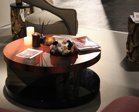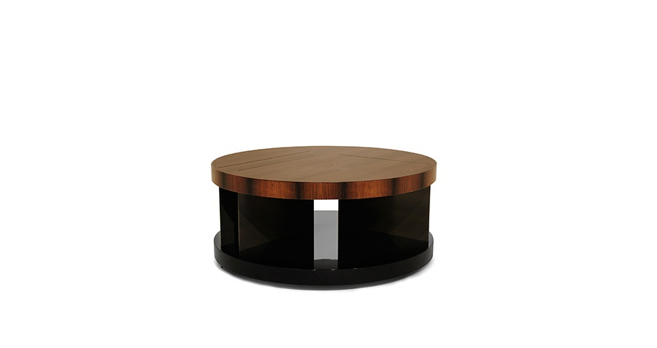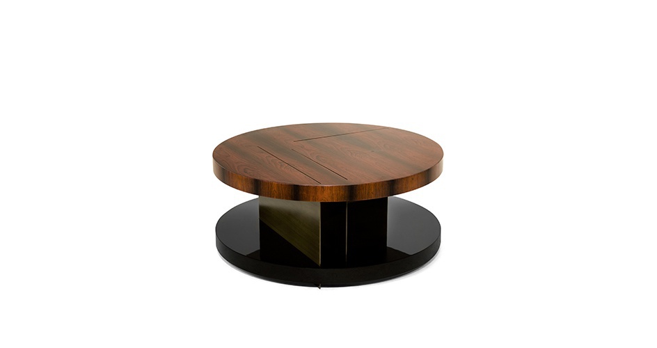 Round coffee table LALLAN from Portuguese manufacturer Brabbu. The model combines the four different material; wood, veneer rosewood, polished brass and antique brass. Finish - black lacquer. The name includes the name of the dialect of southern Scotland, and also designating the integration, blending, and combination of some Scots dialects. All these components are harmonious, despite their asymmetry.