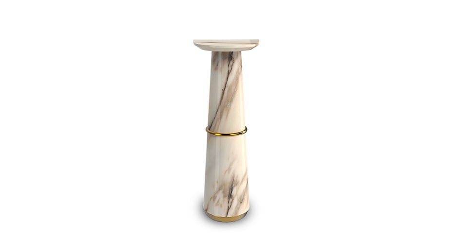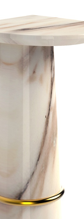 Table - stand AGRA from Portuguese manufacturer Brabbu. It is made of marble with a decorative rim made of brass. Agra modern display like the Taj Mahal, is an impressive display of skill and elegance, perfect for modern interior. Delicate work in marble and touches of brass reflect Golden warm tones to the polished surface. Place it in a modern home decor, be it living room or dining room, or hallway to get strong but sophisticated look.