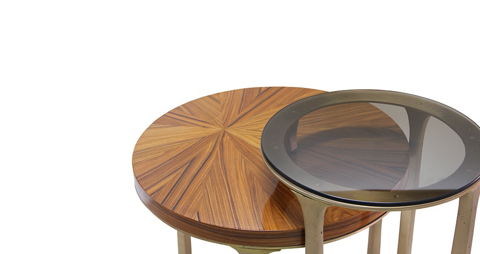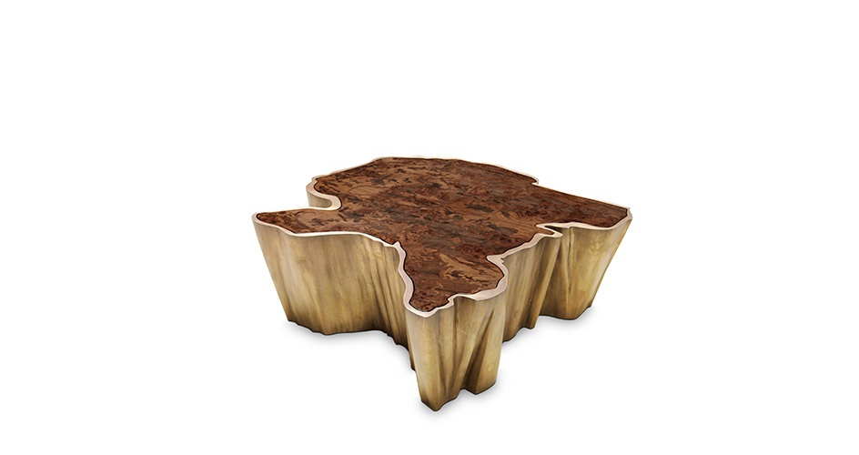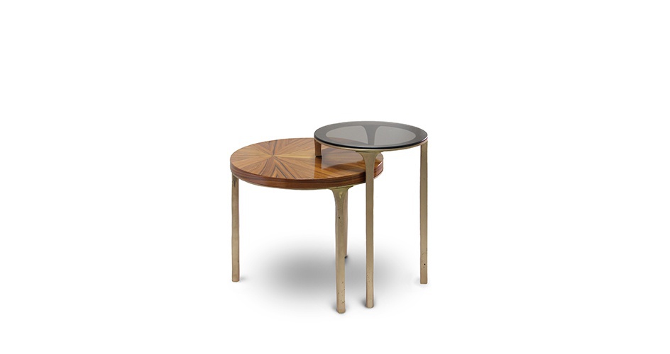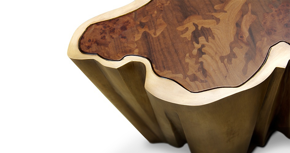 LURAY pridivanny table from Brabbu Portuguese manufacturer. Shenandoah Valley from the valley. The modern model of the two tables on cast brass base with patina coating. Top is made of rosewood and glass. The frame in combination with the bronze glass gives the natural feeling of the caverns environment, where you can find the contrast of warm tones and winter. Rosewood in the lower top brings an intensity and a delicacy around the forest. Its irregular but simple shape brings the caverns stalactites into the house. The perfect addition to any modern interior.
