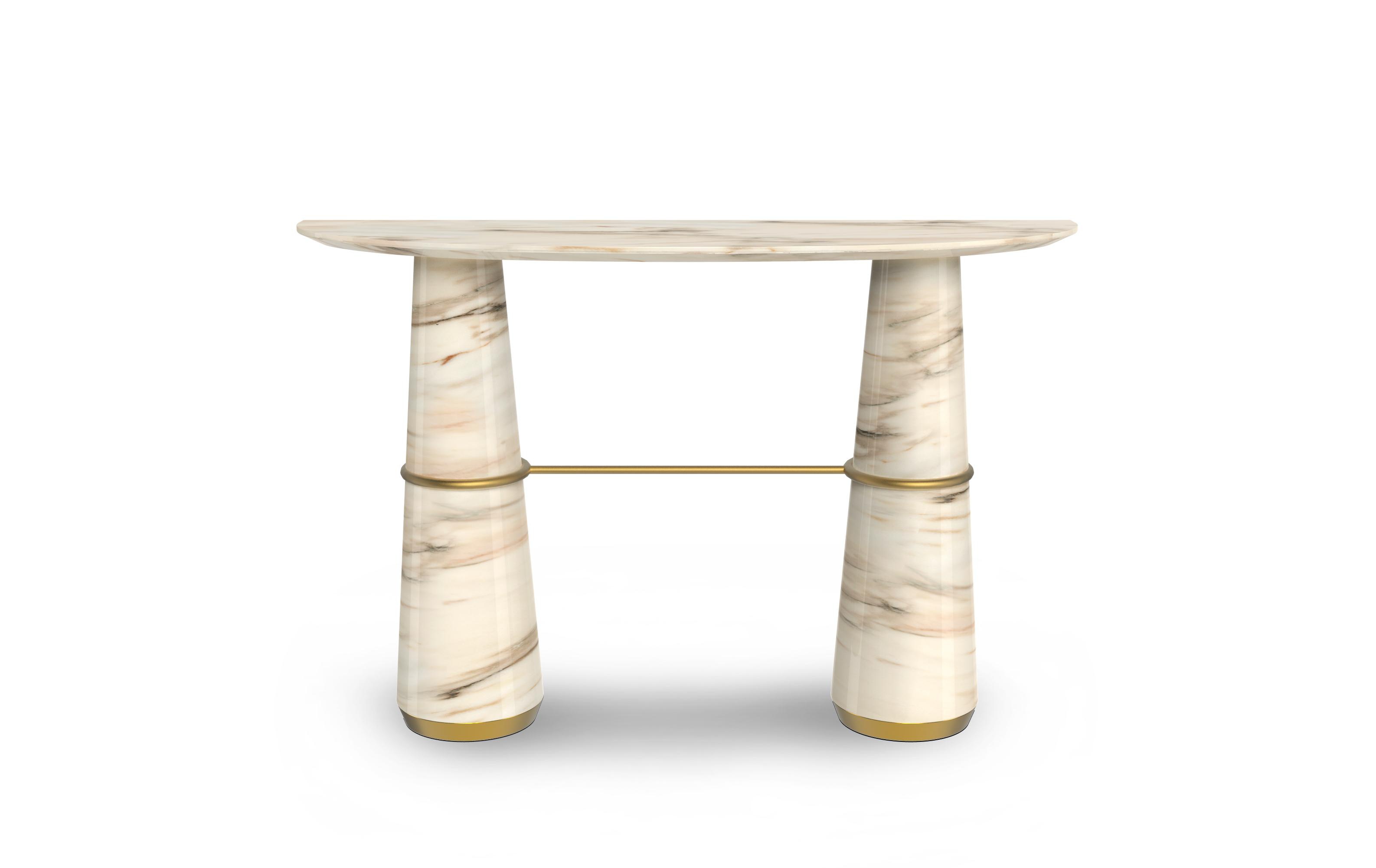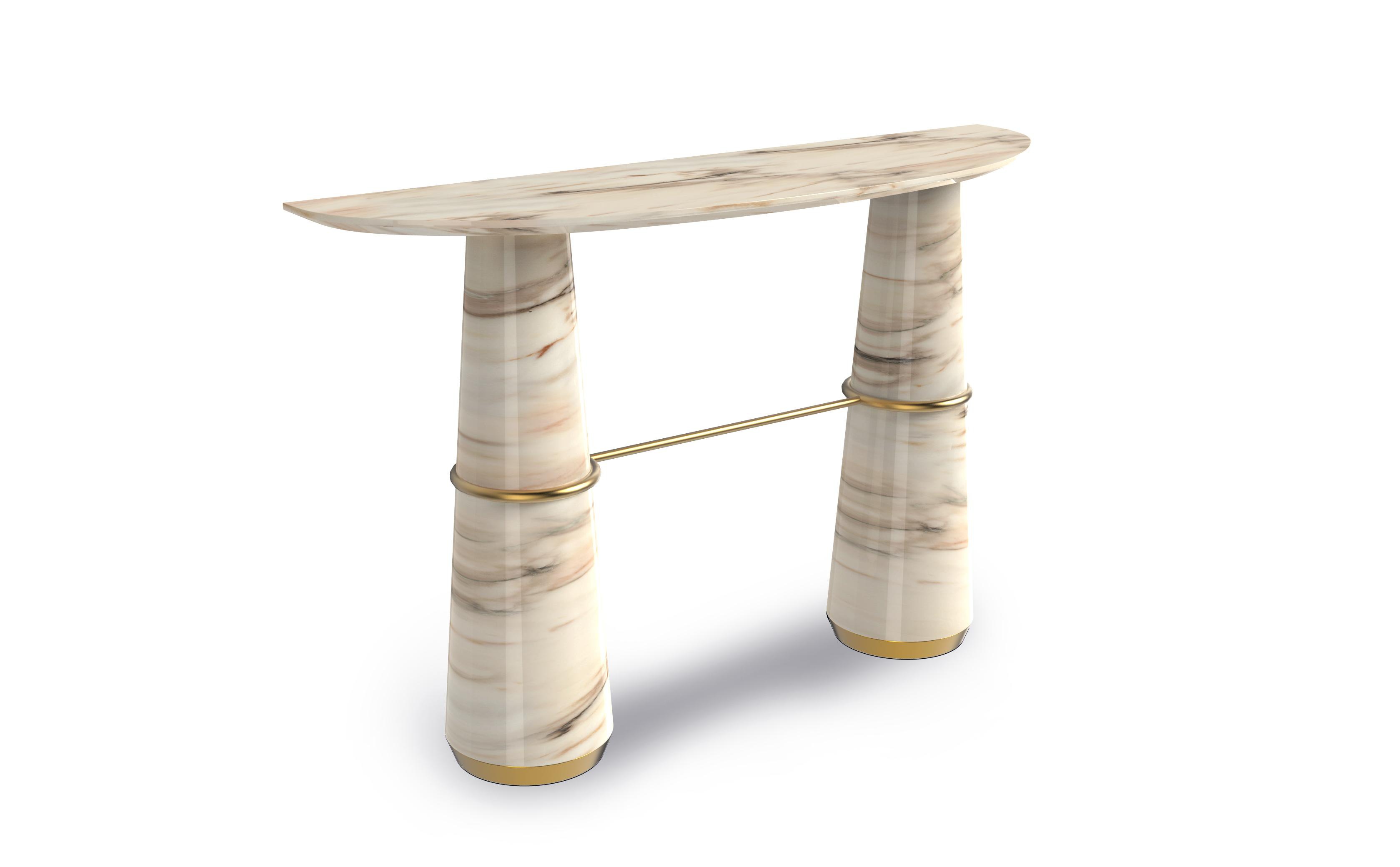 Console AGRA from Portuguese manufacturer Brabbu. It is made of marble with decorative frame made of brass. Table top made from a fine marble softens the imposing structure. Agra modest building of one of the most famous and most celebrated monuments in world, the Taj Mahal, also known as the marble mausoleum. Is an impressive display of skill and elegance, perfect for modern interior. Place it in a modern home decor, be it living room or dining room, or hallway to get strong but sophisticated look.