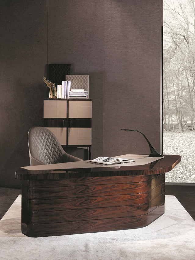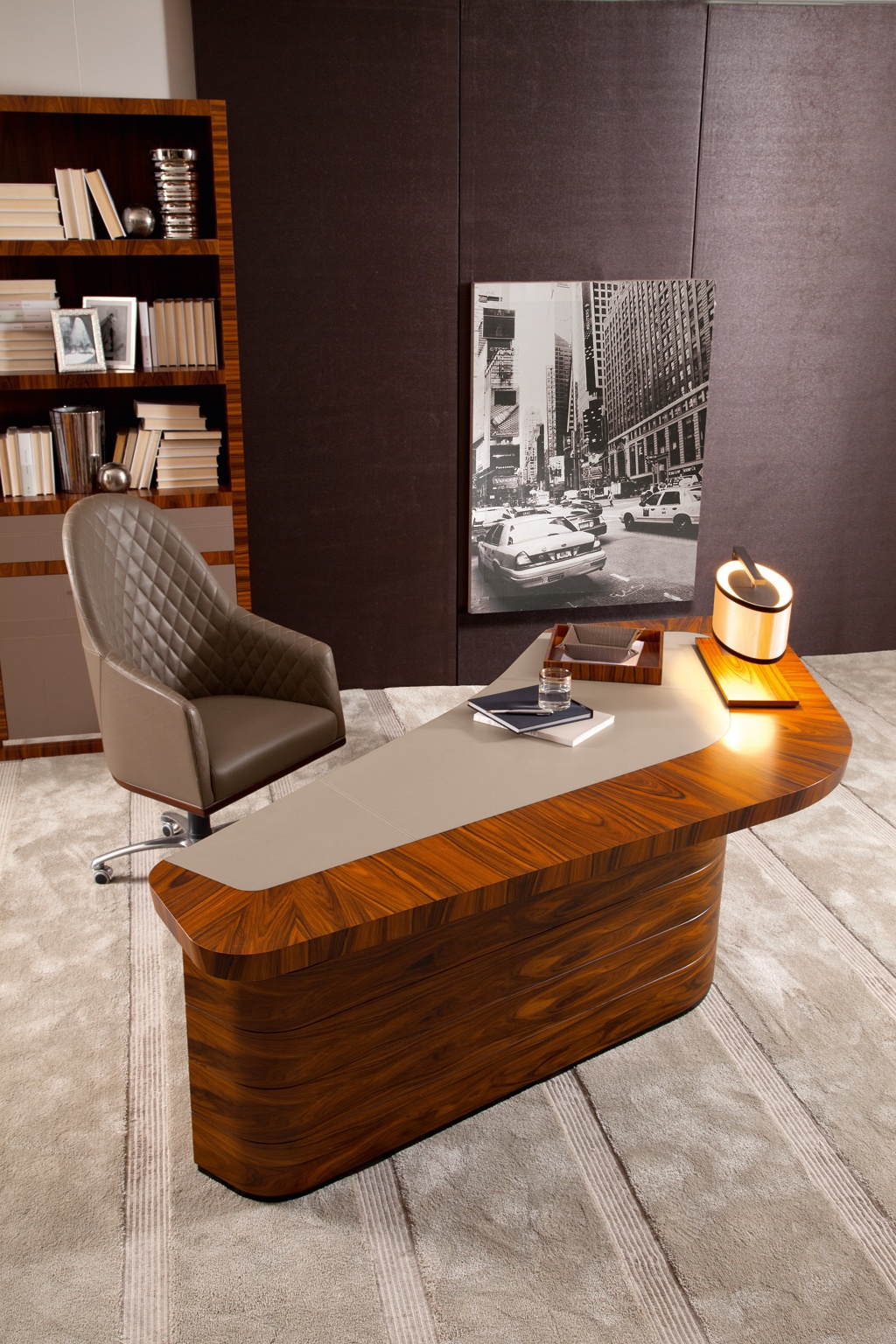 Desk CHAIRMAN from the Italian manufacturer MOBILIDEA. The model with the figured top. The frame is made from wood. Finish offered by catalogue companies. The table is manufactured in contemporary style.