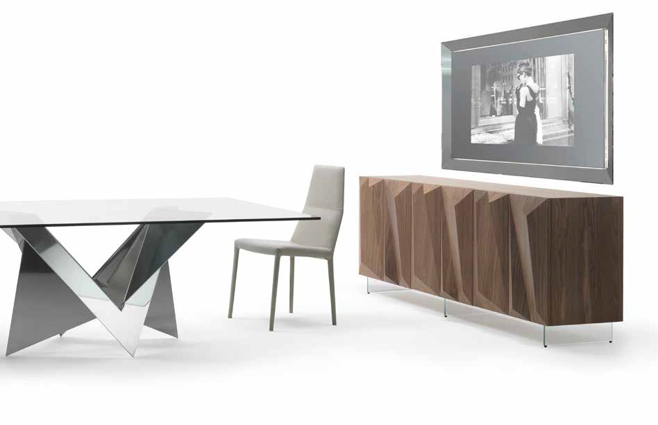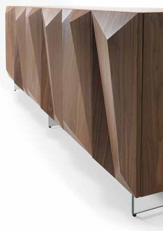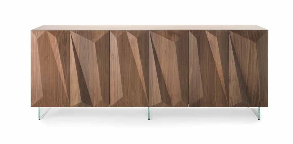 Buffet credenza Quartz from the Italian manufacturer Reflex Angelo. Original model low sideboard with sculptural forms decorate modern interior living room or dining room. The model has three doors with push-pull opening, inside there are glass shelves for the dishes. Frame made of canaletto walnut, finished with a brilliant varnish; the model is also available in black wood finish matte varnish. The legs are made of solid transparent glass. Colours in stock.