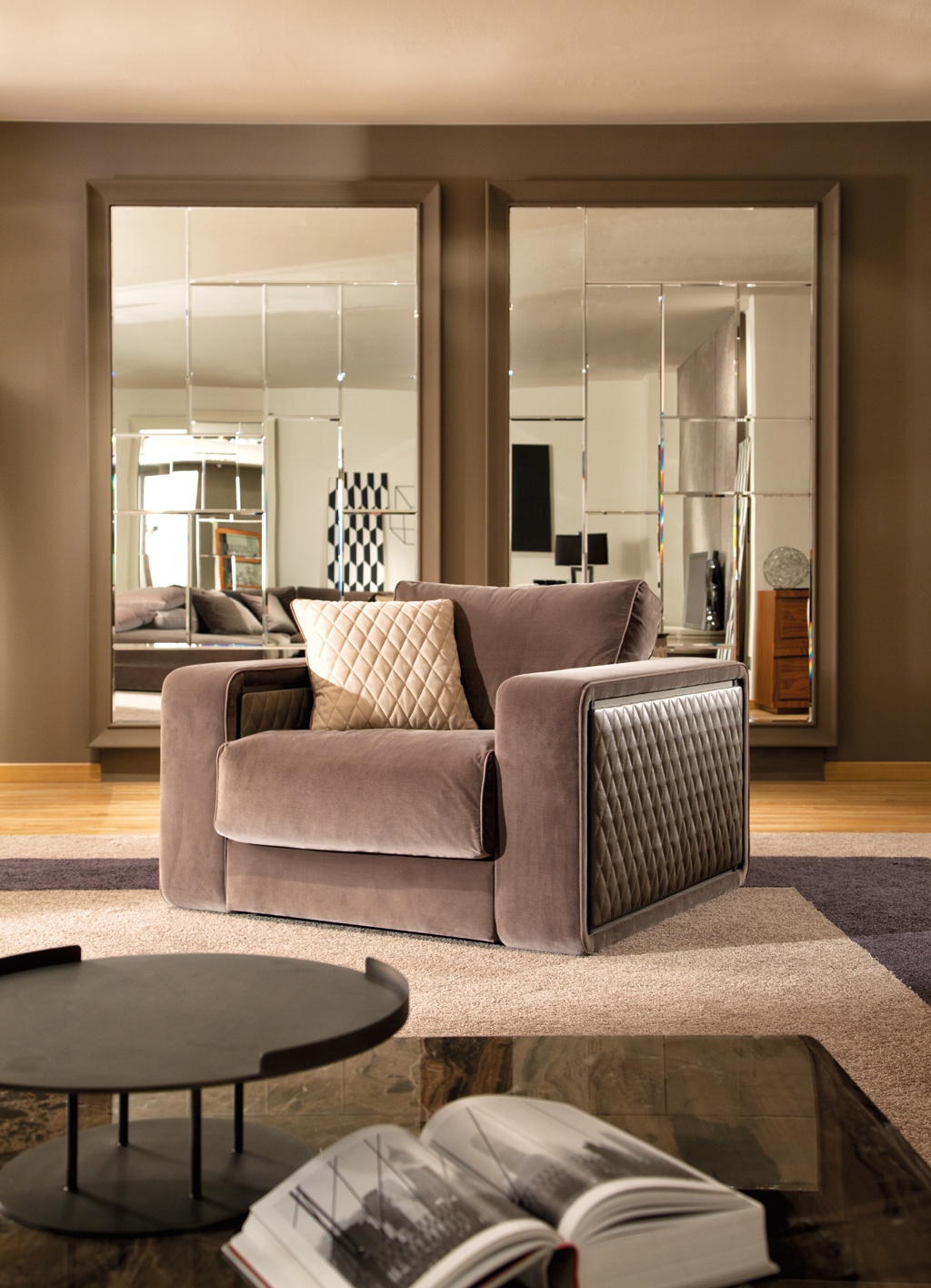 Chair THOMAS from the Italian manufacturer MOBILIDEA. The frame is hidden. Seat and back covered with textiles. Sidewall armrests in leather upholstery. Colors - brown. The model is made in a modern style.