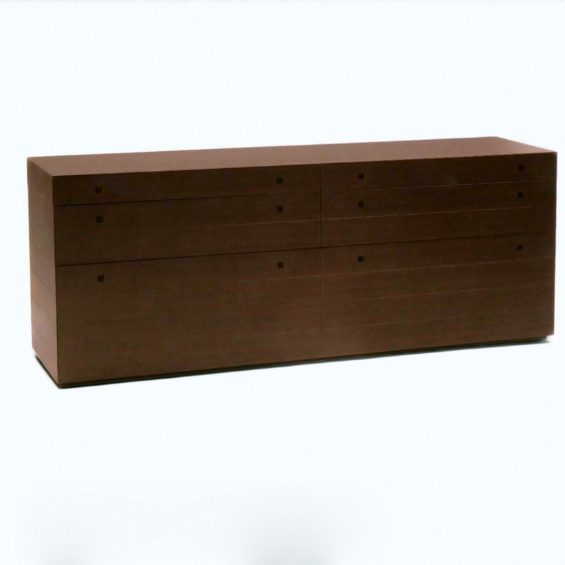 A chest of drawers on a frame of wood Le Pause, Mobileffe. The modern model with pull-out drawers, executed in brown color. The dresser looks great in any interior.