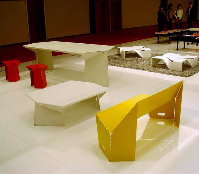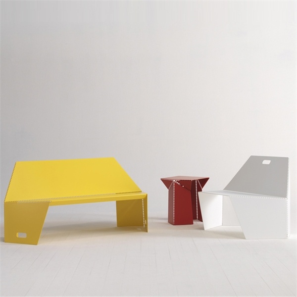 The table is Bent from the Italian manufacturer Moroso. Low table from bent sheet aluminum painted by powder method, on the legs with tips from neoprene. This collection of furniture by young designers Christophe de La Fontaine (Christophe de la Fontaine) and Stefan Diez (Stefan Diez). The model is available in a wide range of warm shades from the collection company from yellow to red.