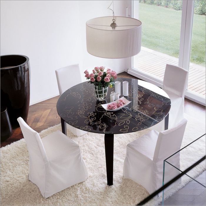 The Flower table from the Italian manufacturer Porado. Round table made of solid ash wood stained oak, wenge, walnut. Top is made of clearly evident and transparent glass, fully lacquered, lacquered with potraviny floral pattern. Color white, black, chocolate.