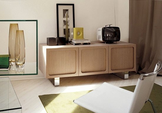 Dresser-the dresser Frame from the Italian manufacturer Porado. The sideboard is made from solid cherry and oak on the wide chrome legs-the runners. Side sections supplemented shelves-trays, in the Central part of a double drawer. The color of light wood.