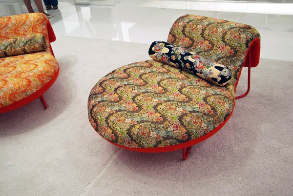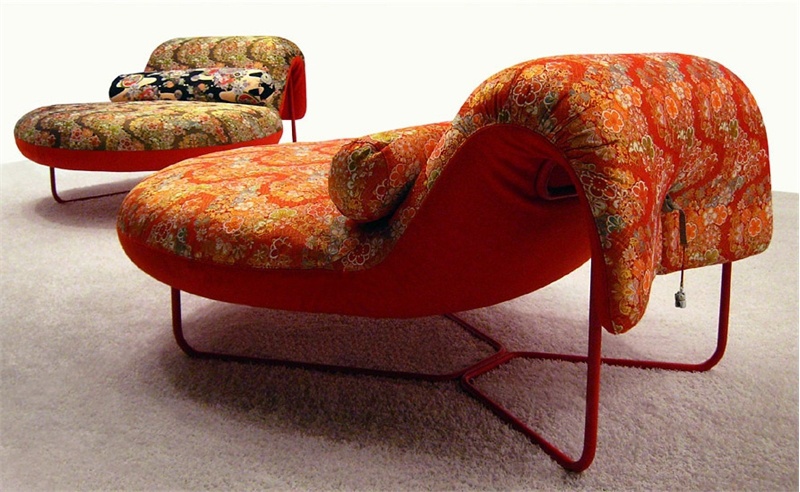 Futton chair of the Italian manufacturer Moroso. A chair on a frame of metal tubes. Upholstery made of colored fabric, which are sewn Japanese kimono. A decorative pillow, cushion. The model name is inspired by the images of two Japanese words "futon" in Japanese rectangular bed of two mattresses, one harder and the other easier and "Futtonda" which means floating in the air, driven by a strong wind.