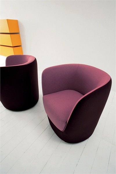 The Opla armchair from Pianca Italian manufacturer. Rotating chair on a "hidden" frame. Upholstery in two colours natural leather or textiles from the collection of the company. Presents a model of two shades of purple combined in one chair. The style of modern furniture.
