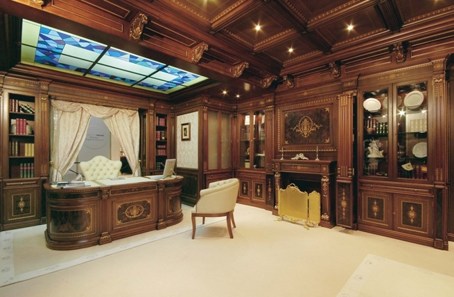 Set of furniture for the office DESPACHO from the Spanish manufacturer Pico. Seat cover made of genuine leather and textile. The Cabinet is made from solid wood and glass fa?ade. The color of the furniture set - natural wood color.