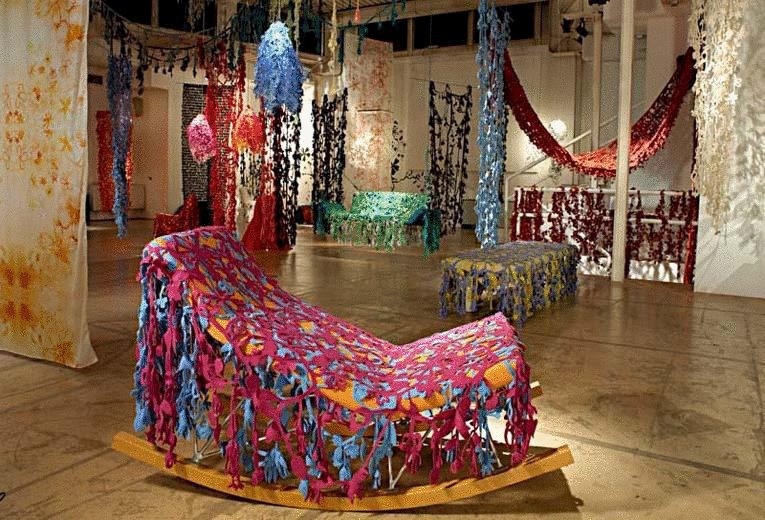 Chair Tord Boontje Collection from the Italian proizvoditeley Moroso. Rocking chair from designer buntje Tord (Tord Boontje). Textile case augmented openwork plaid Cape with signature pattern. The collection also includes sofas, armchairs, chairs in leather and textile upholstery, beds, tables, mirrors (tempered glass with white print) and textile floral decoration.