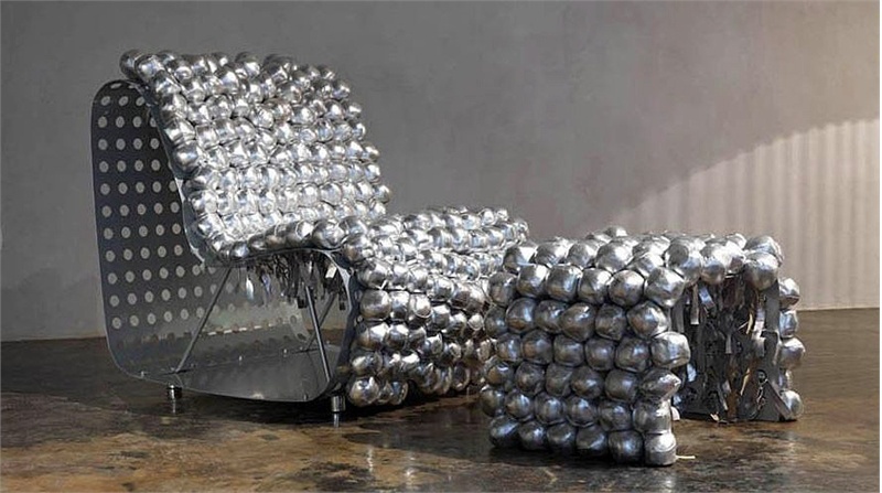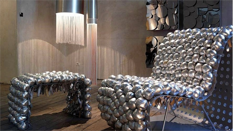 The Blow Up chair from the Italian manufacturer Mussi. The chair and footrest. A steel frame. Through the holes, a threaded perforation inflated balls. Design approach from Maurizio Galante (Maurizio Galante).. Color of this model is metallic.