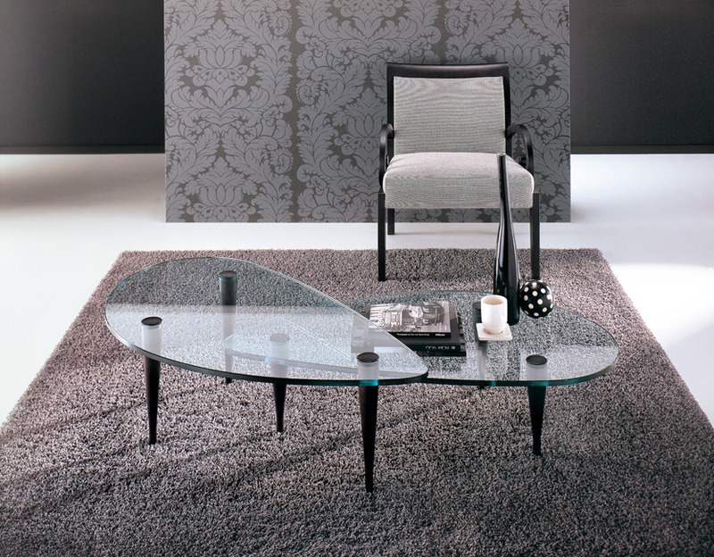 Hago coffee table by Italian manufacturer Porada. Low table with base in solid cherry stained wenge, cherry-American, or painted with an open wood structure. A table covered with a varnish. Two different levels of an asymmetric top is made of glass with a thickness of 15 mm. the attachment System of the legs to the tabletop patented. An optional model is available in two heights.