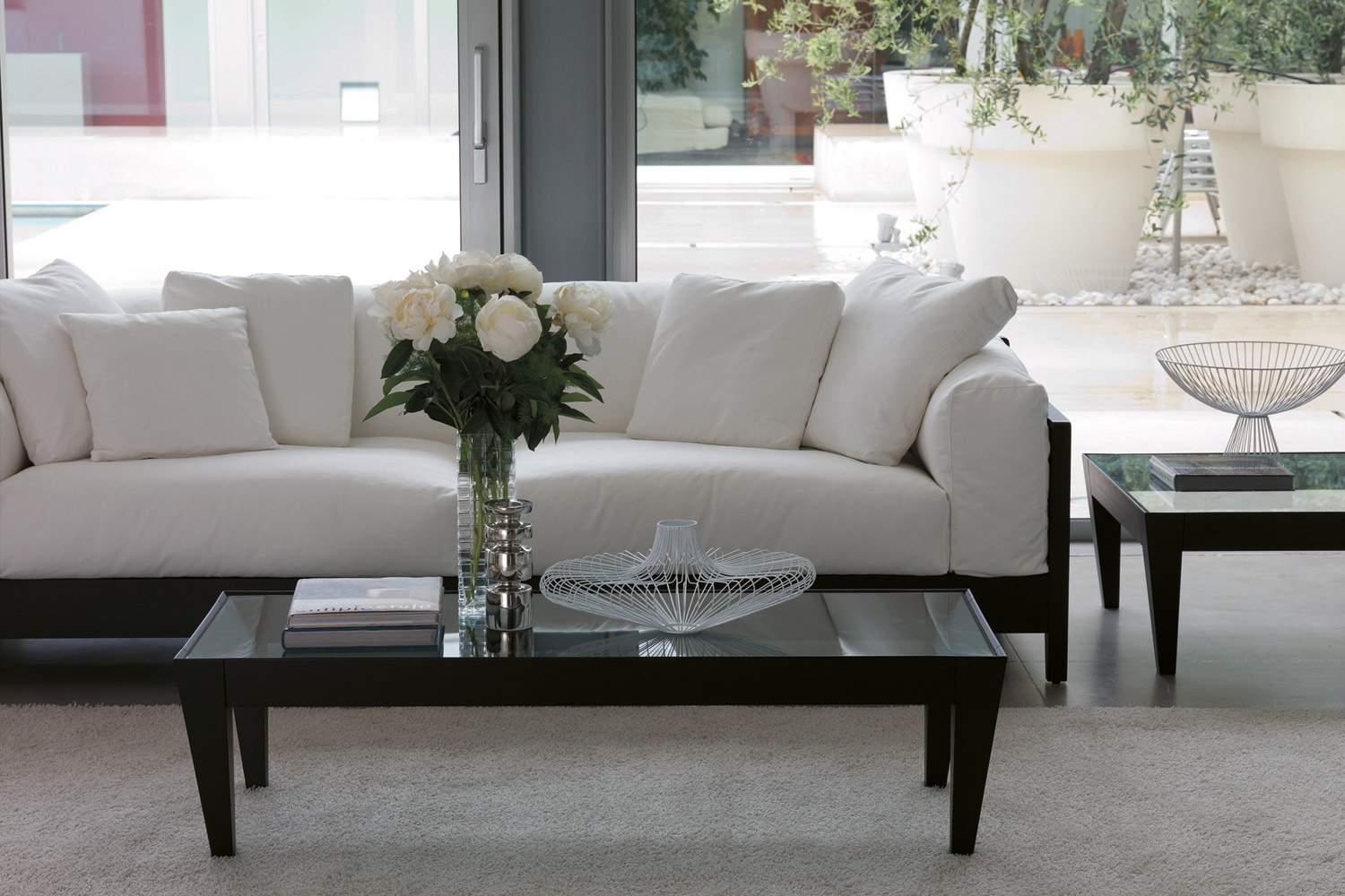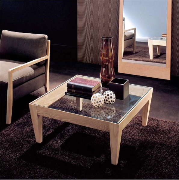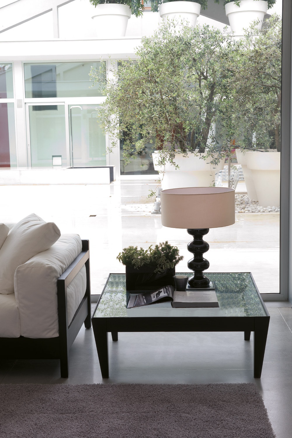 Loch coffee table by Italian manufacturer Porada. Low coffee, low table made of solid ash wood stained oak, wenge and walnut. Table is finished with varnish, not closing the pores of the wood. "Recessed" square, rectangular top made of tempered glass.