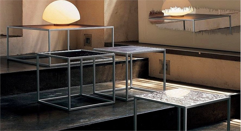 Sit Set from the Italian brand Mussi. Set of low tables and pouf. The frame of the stool is made of wood, the seat upholstery polyurethane foam and nylon. Frame low table in painted steel, top made of wood stained wenge or mirrored and hand painted. Table top this model is made of glass and aluminum sheet.