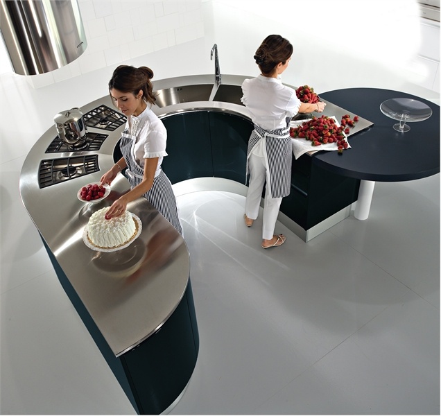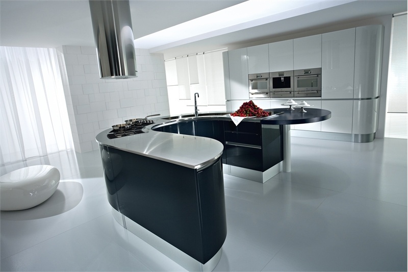 Artica kitchen by Italian manufacturer Pedini. This model is made on a frame of particle Board in melamine finish. The island goes into the bar. Worktop can be made of steel, granite, marble or special composite material. The model is made without visible hardware.