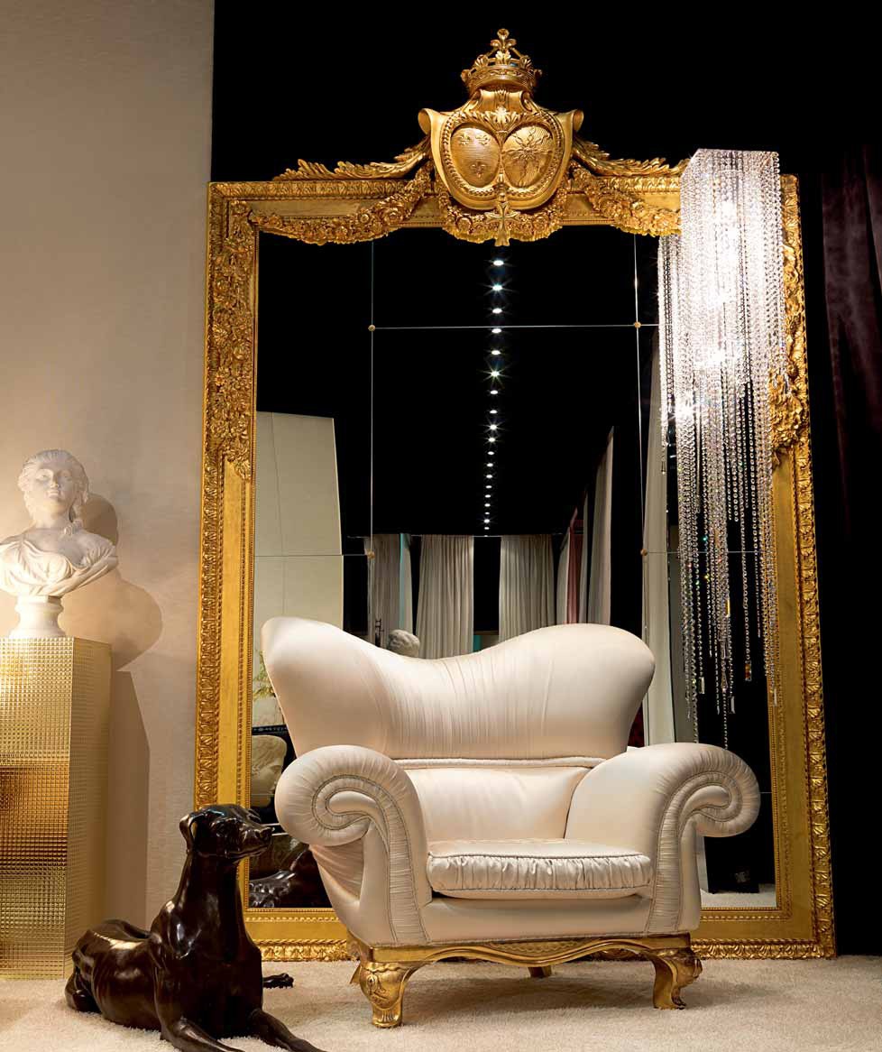The armchair Odeon Armchair from Italian manufacturer Zanaboni, made of solid wood. The model is executed in classical style. Chair with soft arms, legs, handmade, with elements of carving. Finish under the gold. Colours in stock.