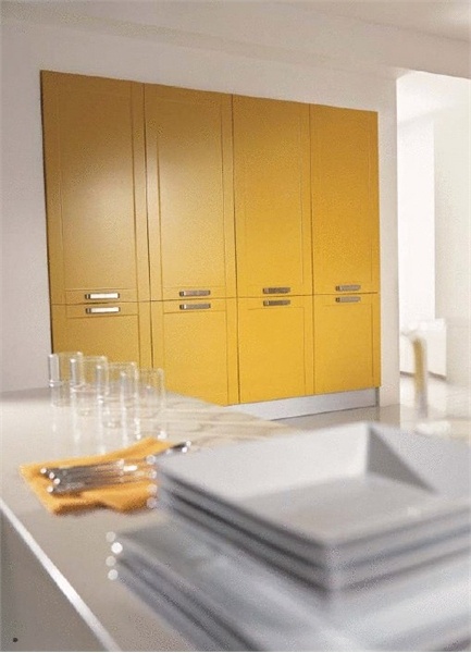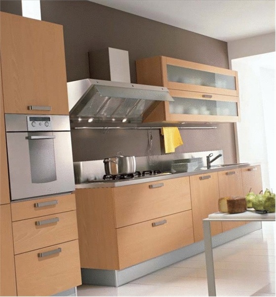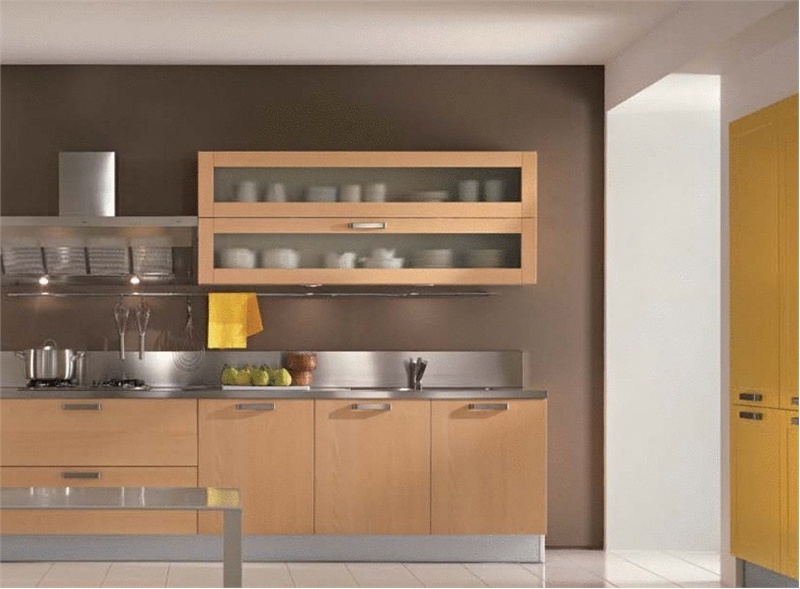 Set for the kitchen Borda from Italian manufacturer Pedini. The model is made of solid wood. Fold the top of the lockers in plastic. Handle and working surface made of stainless steel. The finish offers a matte varnish. Custom kitchen in a modern style.