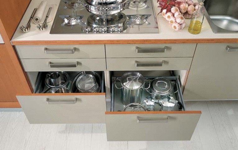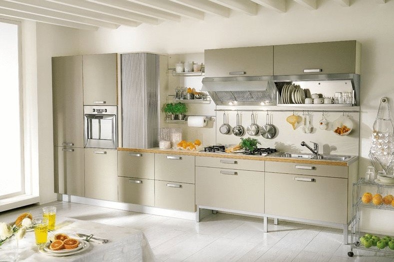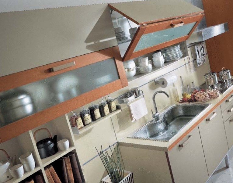 Set for the kitchen Borda from Italian manufacturer Pedini. The frame is made from solid wood. Fittings and stainless steel feet. Fold the upper shelves of transparent plastic. There are several options for finishing. The model is made in a modern style.