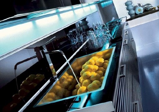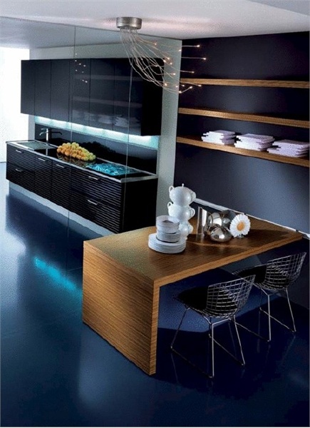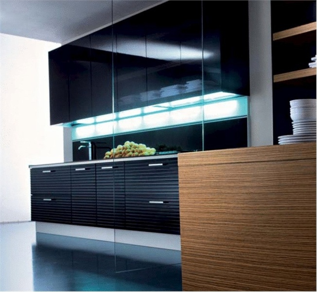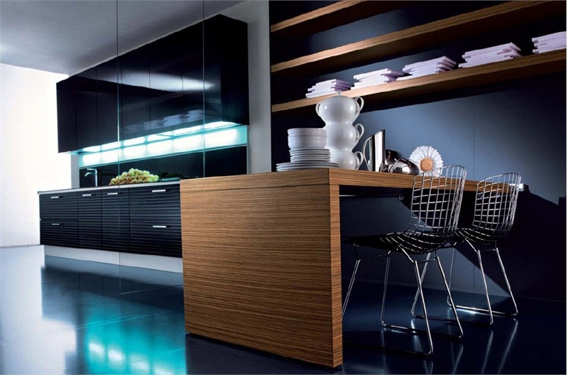 Kitchen Outline from Italian manufacturer Pedini. Frame and fronts made of MDF. Finish offered with veneer or lacquer from the company portfolio. Countertop to choose: stone, glass, stainless steel. Drawers complemented with metal handles. Wall cabinets with glass fronts black. In addition, you can acquire dining table and chairs.