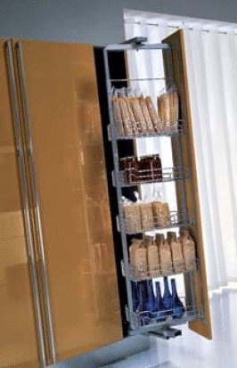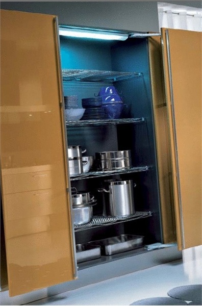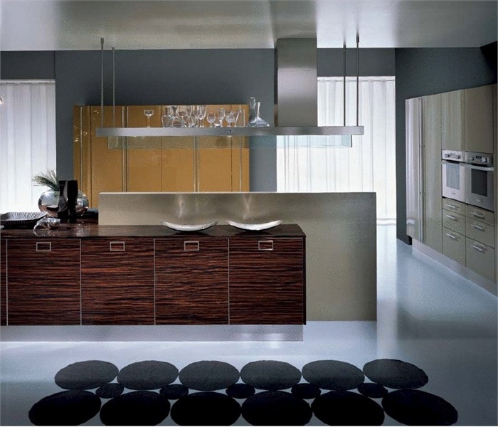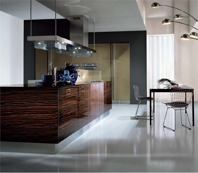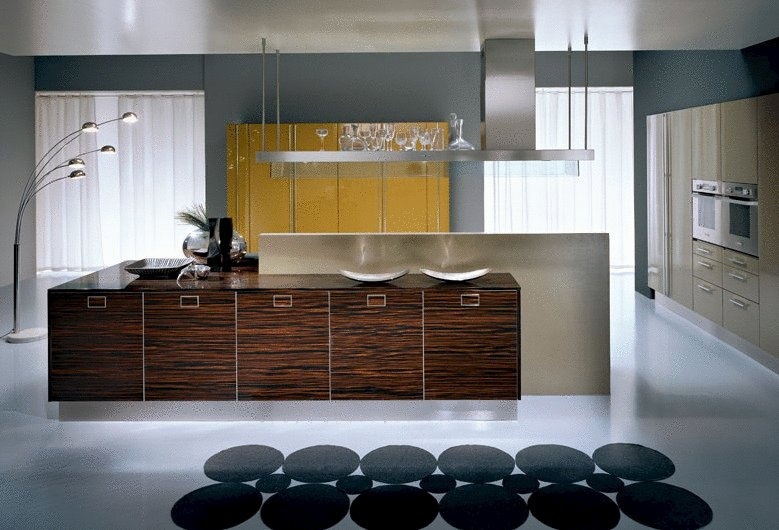 Kitchen Outline from Italian manufacturer Pedini. Modern kitchen model with island and tall columns for home appliances. The frame is made of MDF in veneer finish or varnish from the company portfolio. Stainless steel fittings. Table top made from MDF.